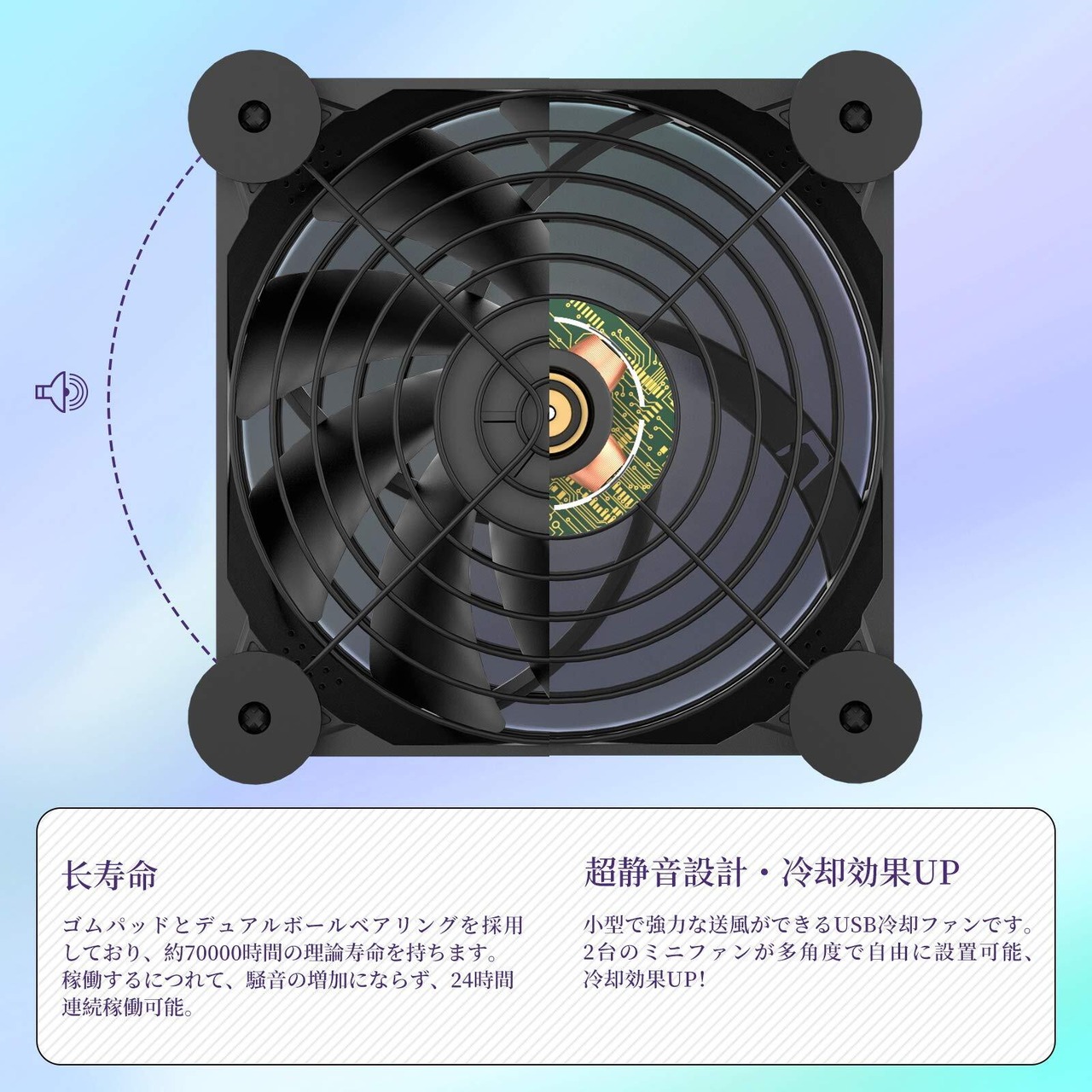 【適用】外付けHDD、ルーター、AV機器、スマフォ、PS4ゲーム機、ハードディスク、PC冷却用などの電子機械を冷やすために設計された冷却扇風機であり、熱がこもり、熱暴走などの問題を解決します。卓上扇風機として、車中泊、空気の循環などのシーンにもご利用いただけます。