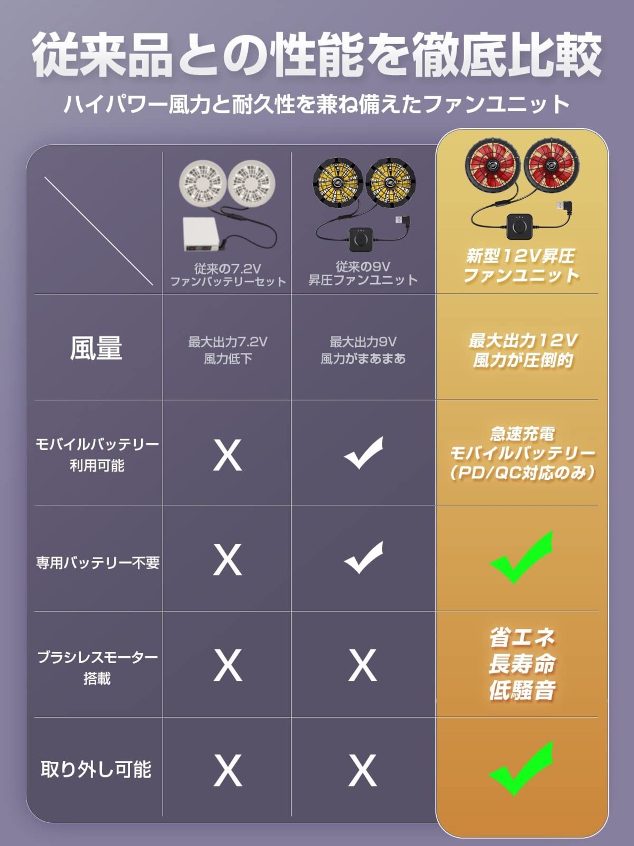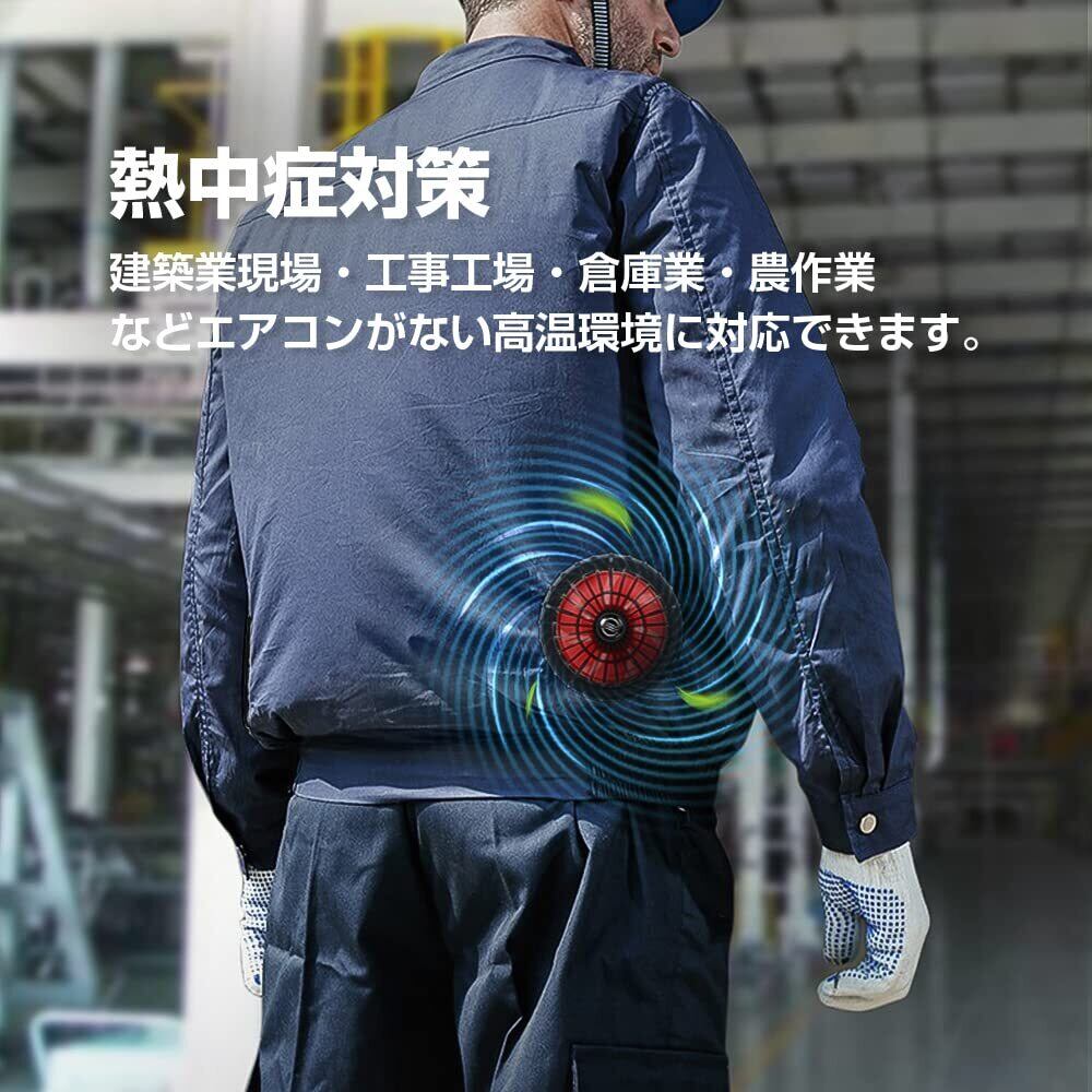 【昇圧可能&12V強風】昇圧機能付き、最高12Vまで電圧が上昇するため、冷却効果が大幅に向上します。最大風速9.8M/Sまた約5600RPMになる高速回転速度で衣服の中にパワフルな風量を実現して体を瞬間に冷やすことができます。このファンユニットは、40度以上の暑い屋外環境でも使用することが可能です。屋外作業を行う労働者が涼しくなり、熱中症予防に最適です。