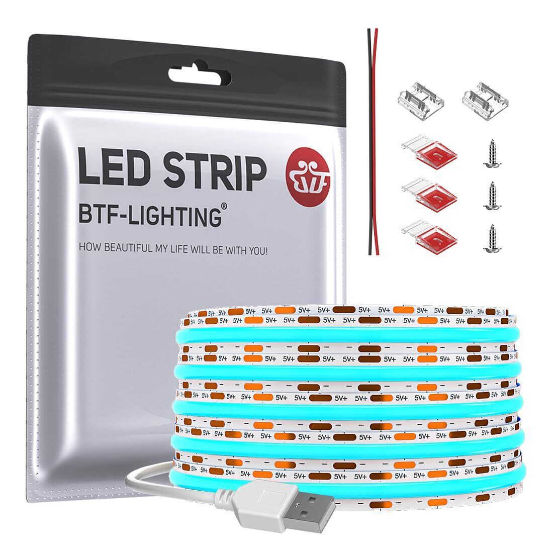 BTF-LIGHTING FCOB COB LEDテープライト USBライト 高密度 フレキシブル LEDテープライト 1M 320LEDs/m アイスブルー 水色ライト 幅8mm ストリップライト DC5V USB 6W/m 調光可能 変形可能 切断可能 寝室 キッチンホーム 屋内装飾 エネルギークラス A+++ 非防水 FOBライト CRI>85 コントローラーがない