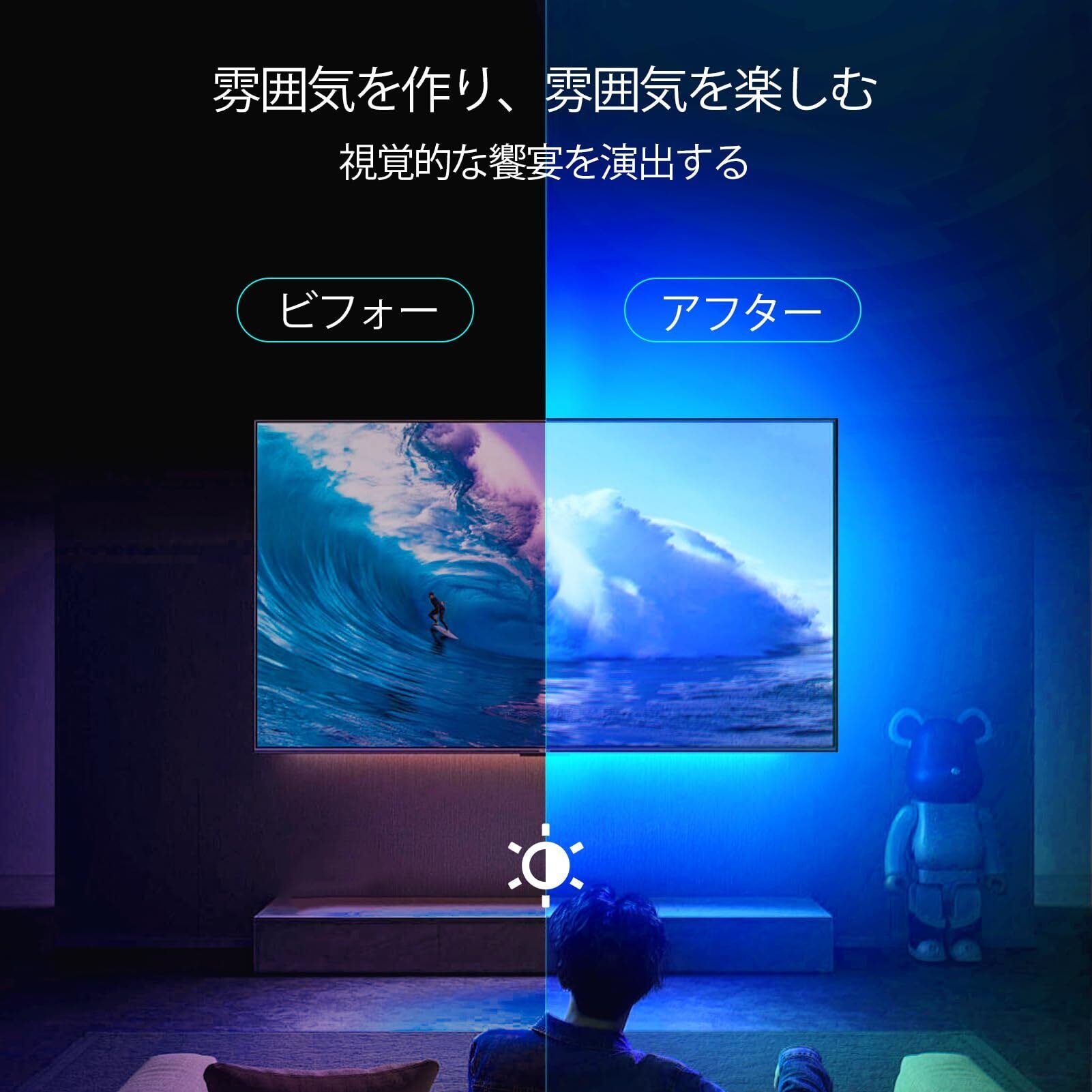 【取付け簡単・USB給電式】強力粘着テープ付き、貼り付けやすいです。USB給電式でテレビのUSBポートだけではなく、モバイルバッテリー、USBアダプター(含まない)、パソコンなどからも給電でき、場所を問わず何処でも設置できます。※テープライトの適応電圧/電流はDC5V/1Aで、出力電圧5V以上のUSB端子に使用しないで下さい。注意:ライトテープがしっかりと接着できるようにするために、ライトテープの背面の接着剤は非常に粘着性が強いので、テープを引き裂くときはライトテープを引き裂かないように注意してください。