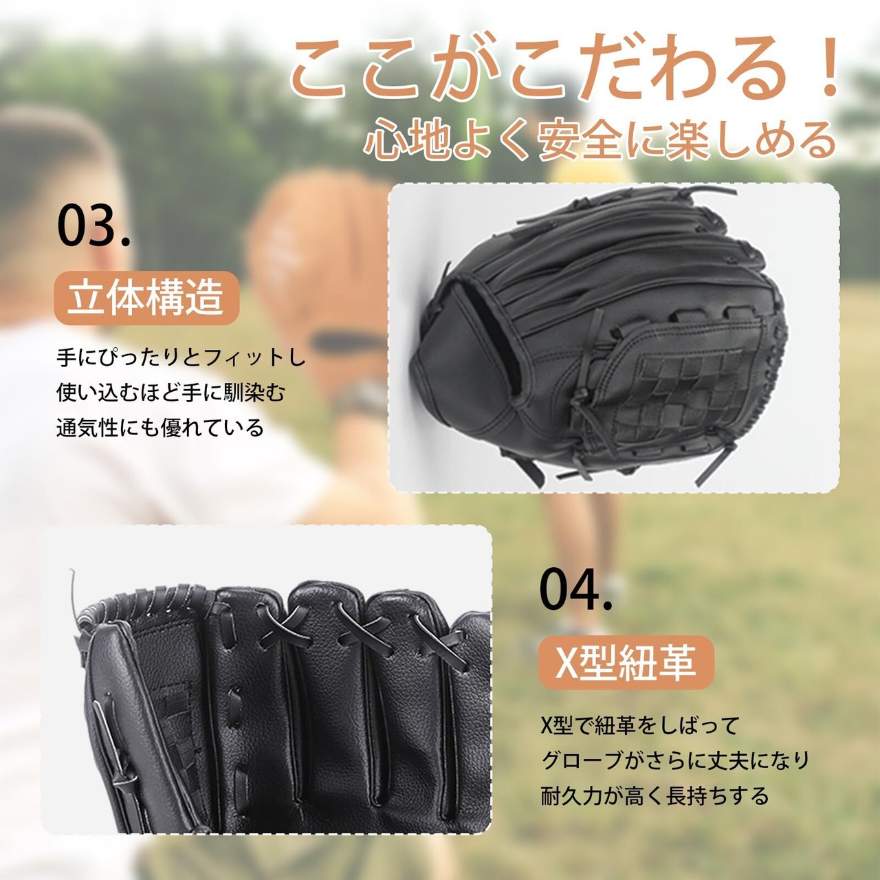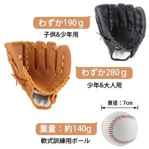 【製品仕様】[素材]人工皮革 [手の向き]右投げ用(左手着用) [適用対象]子供/少年/大人(ユニセックス) [用途]野球用/ソフトボール用/練習/試合/キャッチボール [カーラー]ブラウン/ブラック(二色選択可能) [製品重量]12.5インチ約282g/10.5インチ約191g/ボール約141g ※ご注意:道や車の通る場所、人通りの多い場所でのキャッチボールは危険ですので絶対に避けてください。