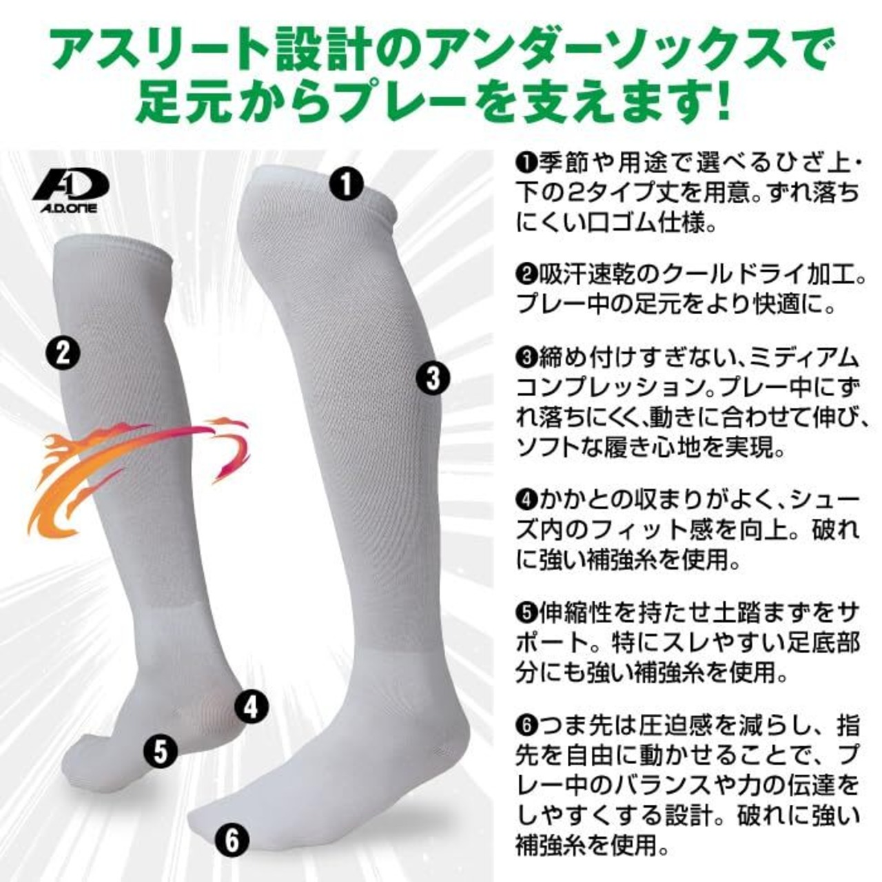 吸汗速乾と抗菌防臭加工を施しており、日々の練習をサポートします。つま先とかかと部分を補強しており、消耗を軽減。3サイズで子供・女性・男性問わずお使いいただけます。