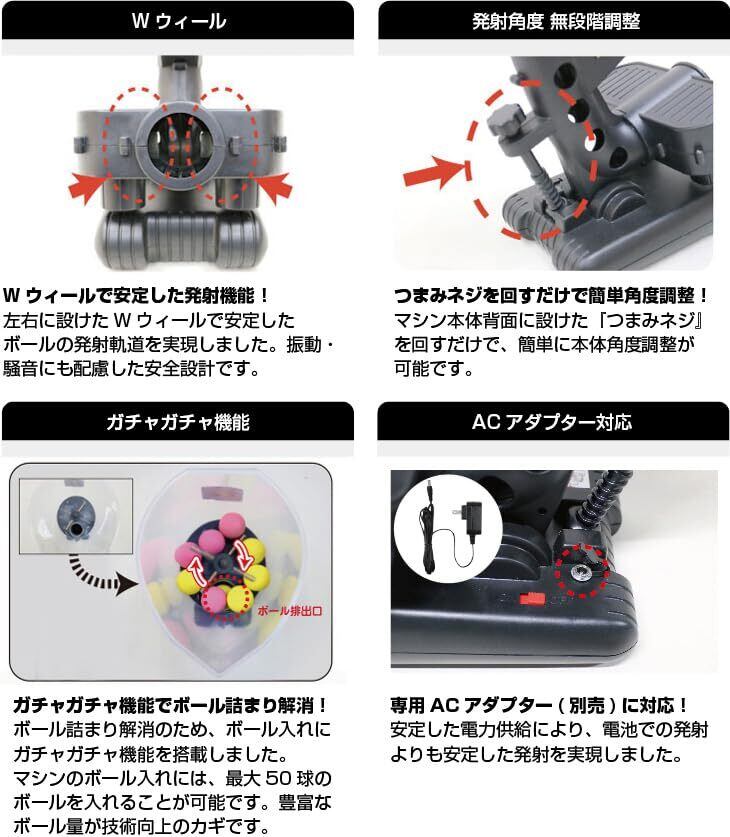 ■電源: 【別売】単2乾電池4本 【別売】専用ACアダプター ■電池連続稼働時間:約6時間(日本製アルカリ電池) ■付属品:ミートポイントボール10球 ■生産国:中国 【FACAD-101】安定した電力供給を実現! ■サイズ:コード約2m ■生産国:中国 ■ACアダプター対応機種 ・FSSMー220 スピードシャトルマシン ・FTMー253 トスマシンフロントトス ・FPMー153PU 変化球対応バッティングマシン ・FTM-401 ミートポイントボール・トスマシン ・FPM-103 インドアバッティングマシン ・FTTM-261T テニスボールトスマシン