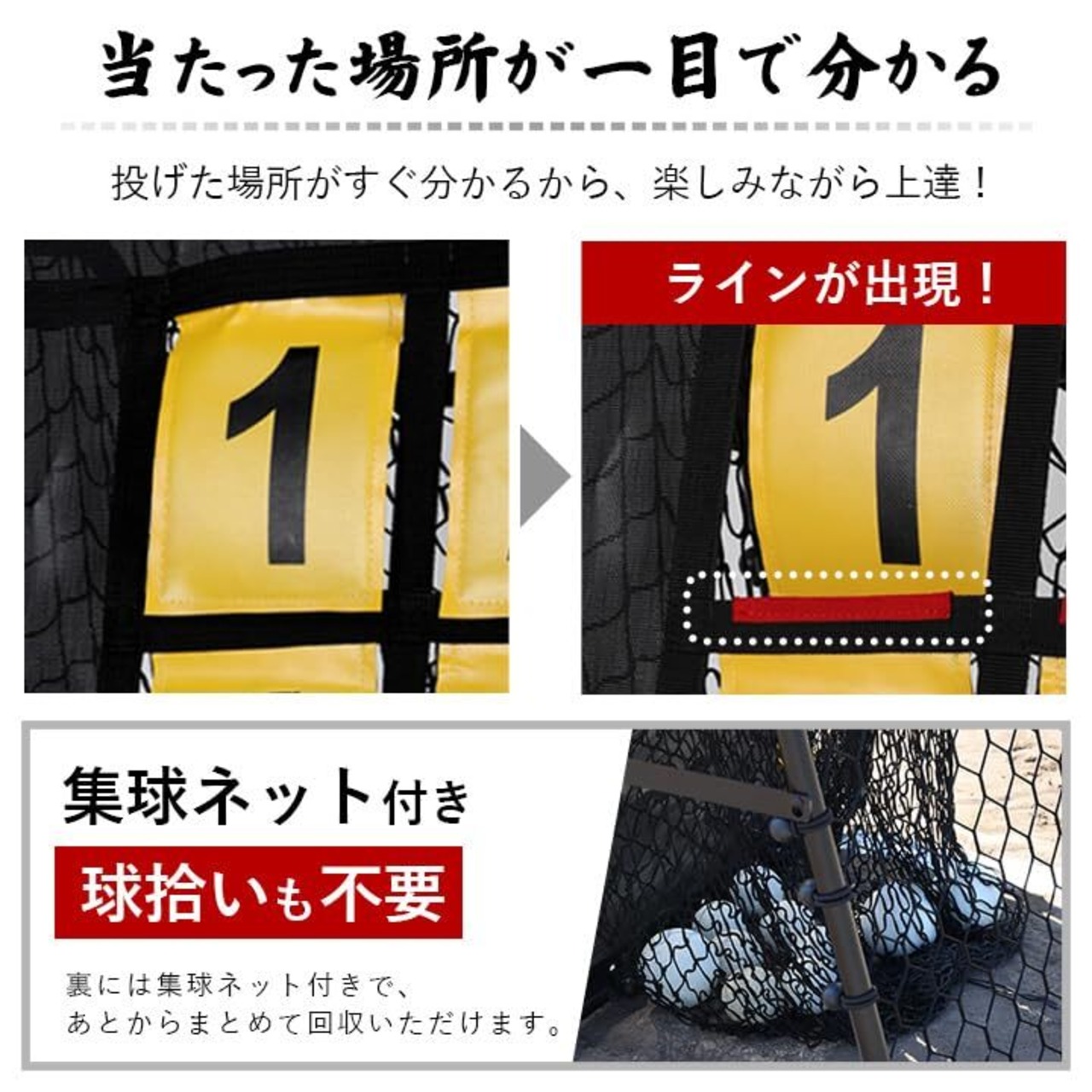 【1台2役!個人練習の決定版】ピッチャー野球少年のお悩み「狙ったところに投げたい…」「家で練習したいけど、1人ではできない…」そんなお困りごとを解決!1台で投球・捕球、どちらも練習可能。従来品は、ピッチング・キャッチング、いずれか片方しか練習できないネットが一般的でした。当製品は、表面はストラックアウト、裏面はリバウンダーとして活用でき、ピッチングも捕球も両方練習が可能です。角度調整2段階。角度を変えるだけで、ゴロ・フライの切り替えが可能。角度調整も簡単です。