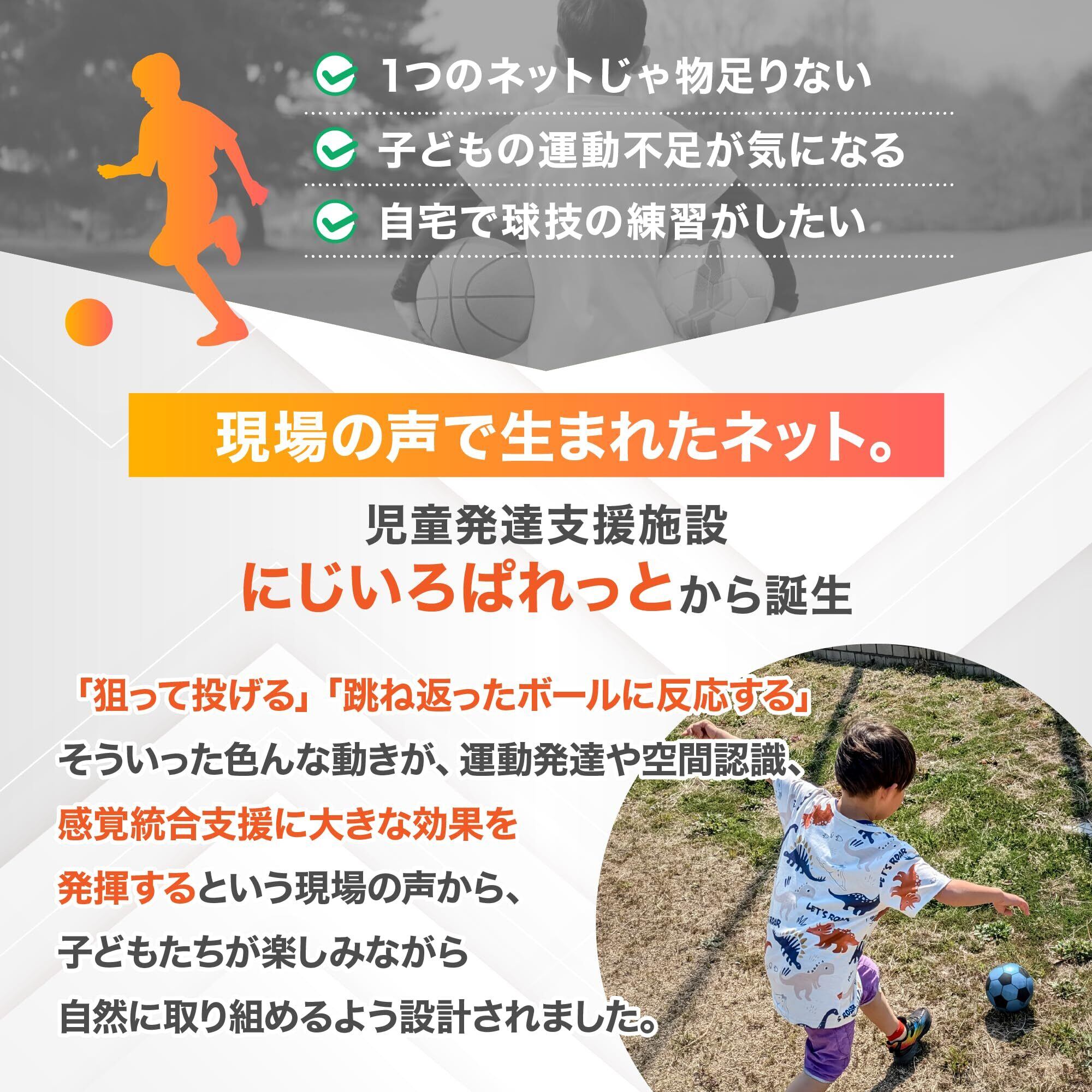 【両面2way構造】にじいろぱれっとが独自開発したオリジナル設計。リバウンドネット、トレーニングネット付。これ1台で、野球、サッカー、バスケ、テニス、バレーボールなど様々な球技に幅広く活用可能!子どもから大人まで幅広く楽しめます。