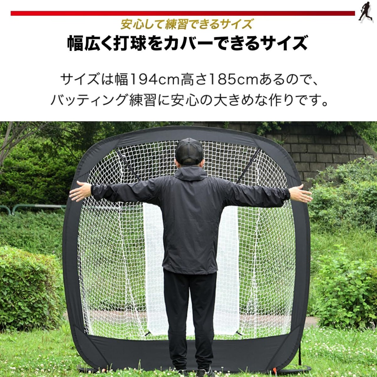 【幅広く打球をカバーできる幅194cm】 サイズは幅194cm高さ185cmあるので、バッティング練習に安心の大きめな作りです。