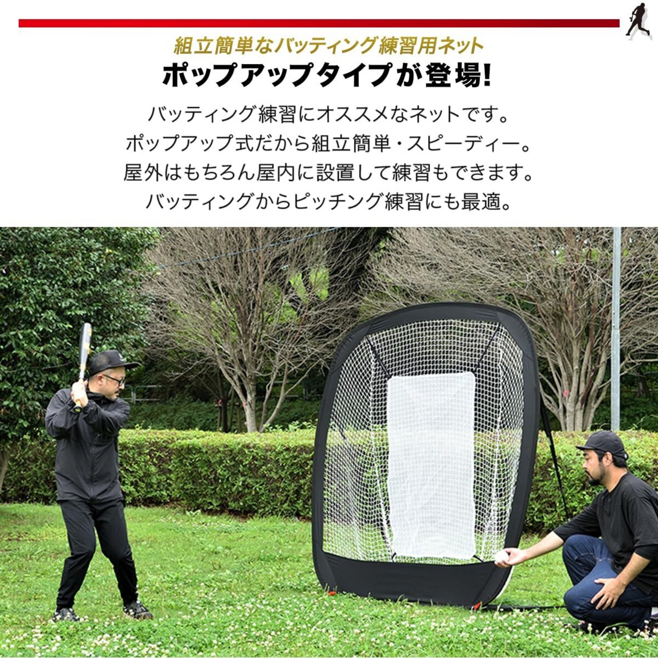 【組立簡単なバッティング練習用ネット】 バッティング練習にオススメなネットです。ポップアップ式だから組立簡単・スピーディー。屋外はもちろん屋内に設置して練習もできます。バッティングからピッチング練習にも最適。※こちらの製品は硬式ボールには対応していません。