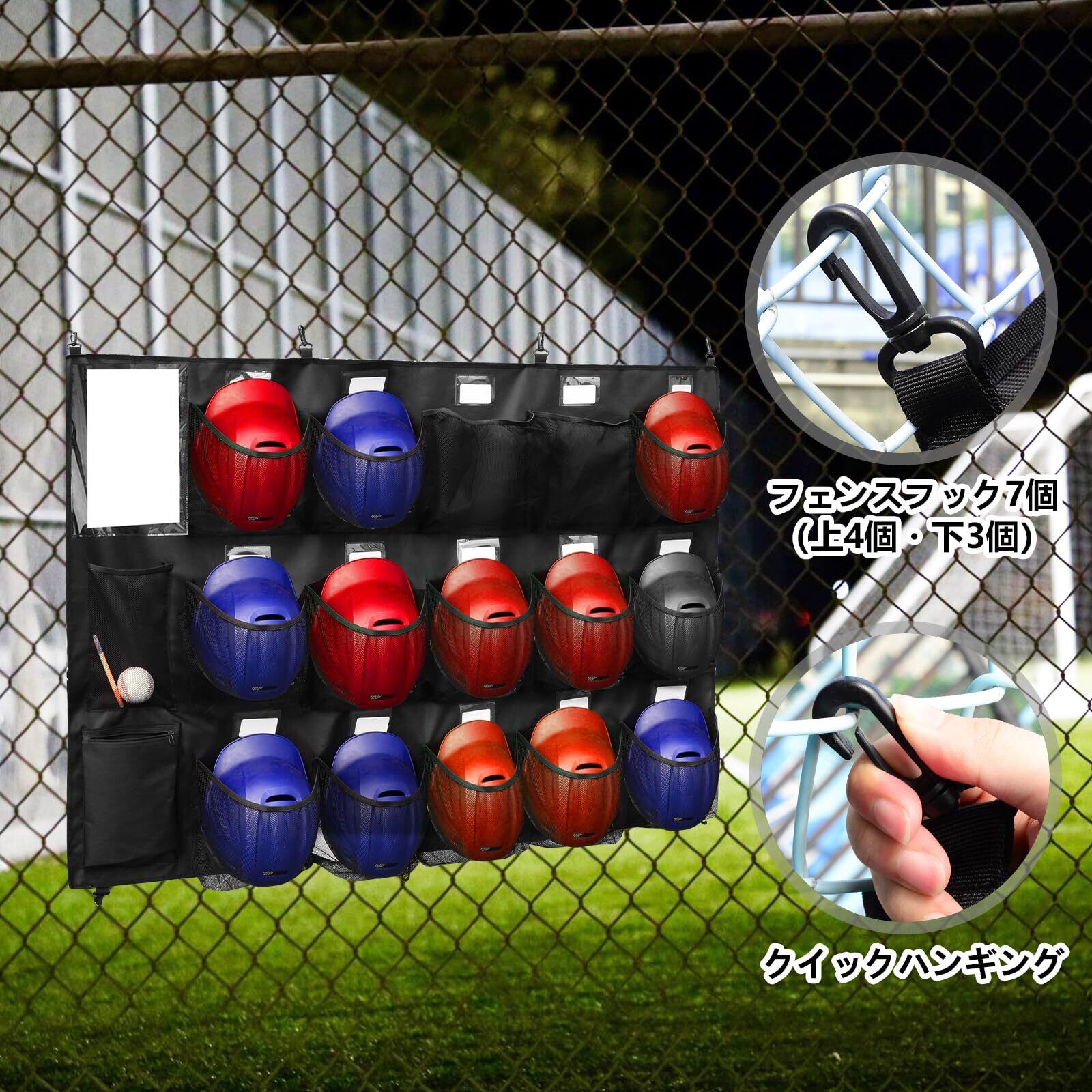 Hikeen ヘルメットバッグ 野球用 吊り下げ式ヘルメットバッグ 野球 ソフトボール 最大15人まで収納可能 バットラックを付き 12本野球バット収納可能 グローブ ボール 整理収納