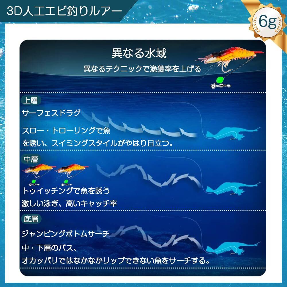 3D人工エビ: 詳細な外観と現実的なプロポーションのエビのルアーは、本物のエビの外観と感触を与える。このルアーは柔軟に泳ぐことができ、魚が抵抗するのが難しい水の中で積極的に生きている。