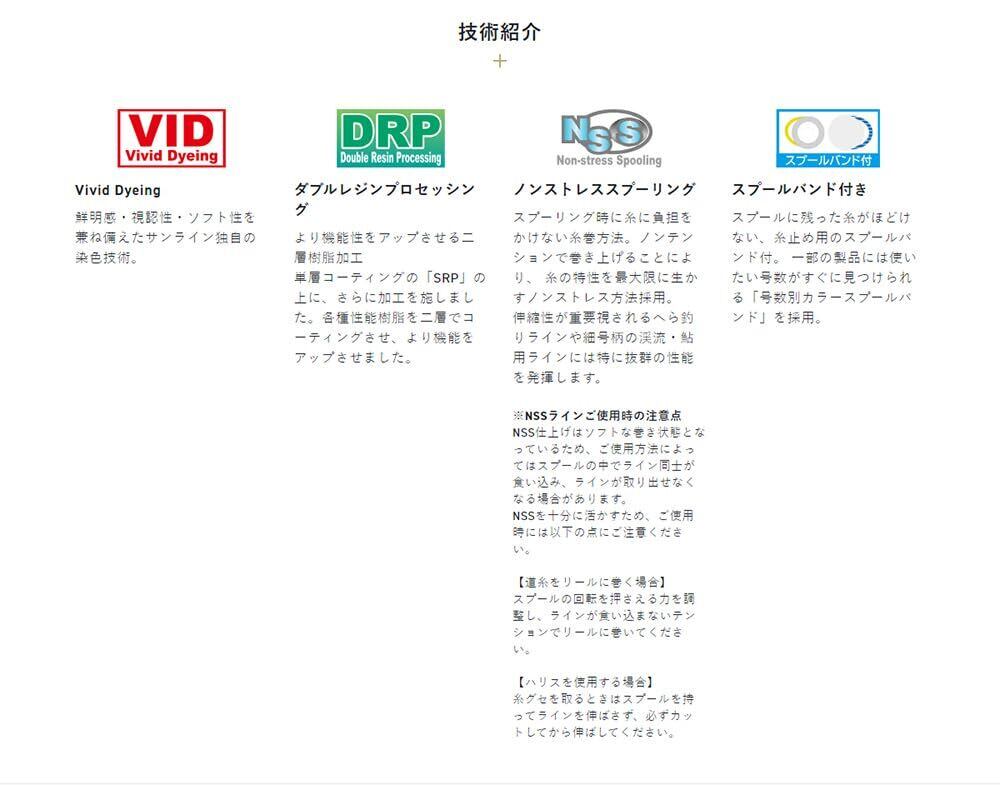 搭載機能: 「VID(Vivid Dyeing/染色技術)」 「DRP(ダブルレジンプロセッシング/二層樹脂加工)」 「NSS(ソフト巻き状態/糸巻方法)」 「スプールバンド付」