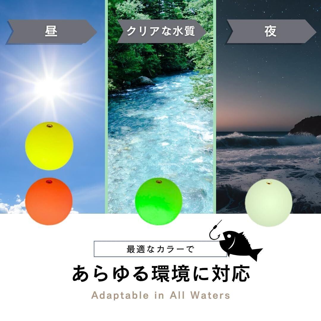 【視認性抜群】 明るくはっきりとした赤、緑、黄、白(夜光)の4色展開で、天候や水質に応じて適切なカラーを選べます。昼間は赤や黄、透明度の高い水質では緑、夜釣りには夜光が最適で、あらゆる環境においてウキが確認しやすくなります。