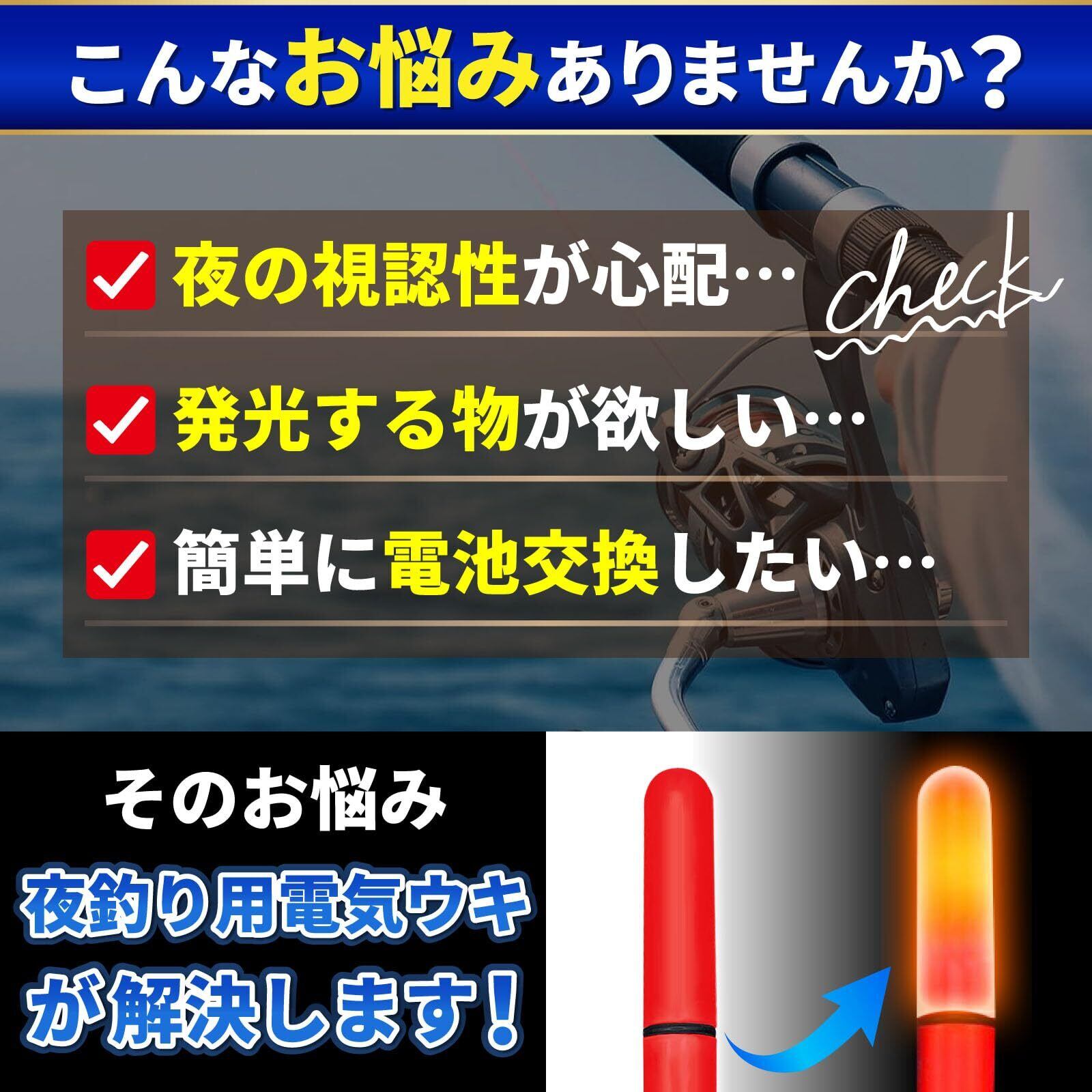 夜釣りに最適な発光アイテムの電気ウキは、発光することで集魚効果とアタリを視認しやすくなります。