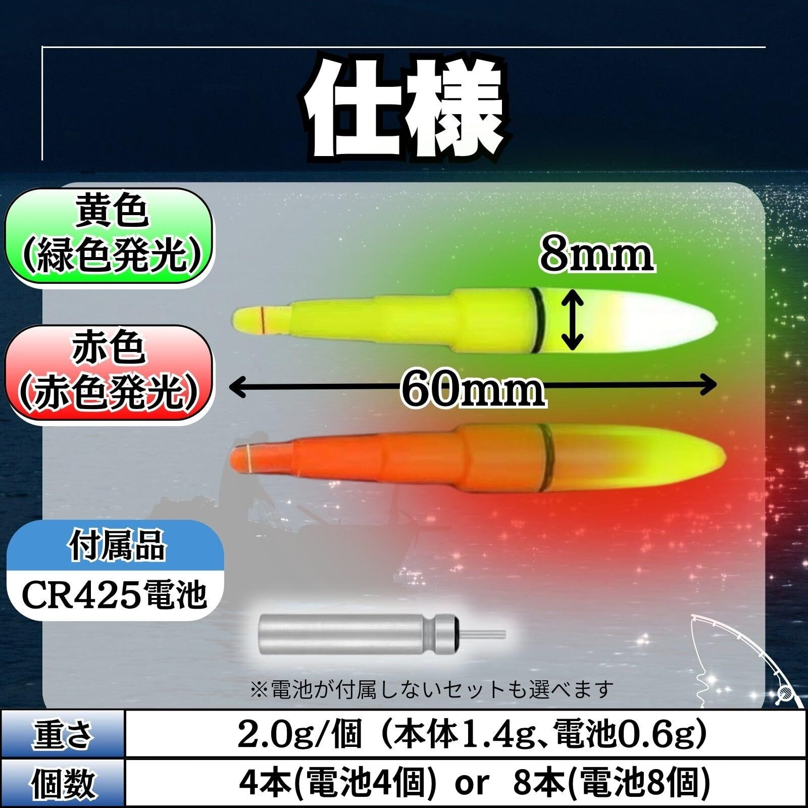【選べるセット数!4本 or 8本+電池付き】電気浮き本体に加えてCR425電池がセットになったお得な内容(電池なしセットもあります)。4本セット、8本セットから選べます。夜釣りファンに最適な電気ウキセット。