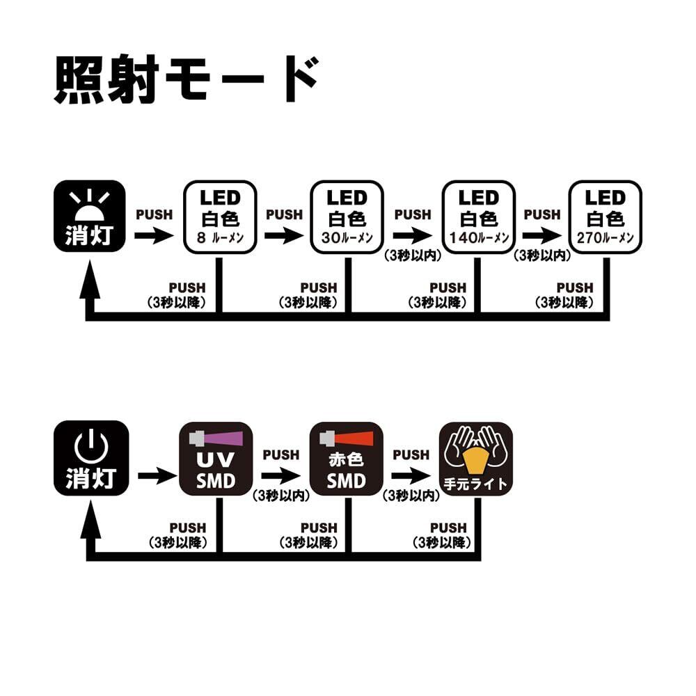バッテリー残量表示付き。クイックオフ機能(3秒後以降に1回押せばオフ)。メモリーライト機能(前回使用のライトから点灯)。USBタイプC。暖色LED手元ライト。