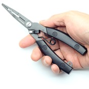 スプリットリングオープナー(#3-#6スプリットリング推奨)、ギザ刃ラインカッター(ナイロン・フロロ・PE対応)、片手で開閉可能なロック部、スリーブカシメ、エンドロープ・ランヤード取付穴