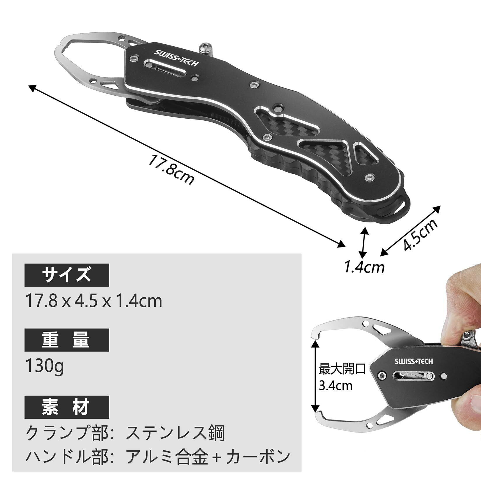 【商品仕様】SWISS+TECHフィッシュグリップ本体のサイズは長さ17.8x最大幅4.5x厚み1.4cm、重量は約130g、耐荷重:18kg、クランプが開口時最大3.4cm、パイラルコードの長さは約24cm(伸縮性あり)。