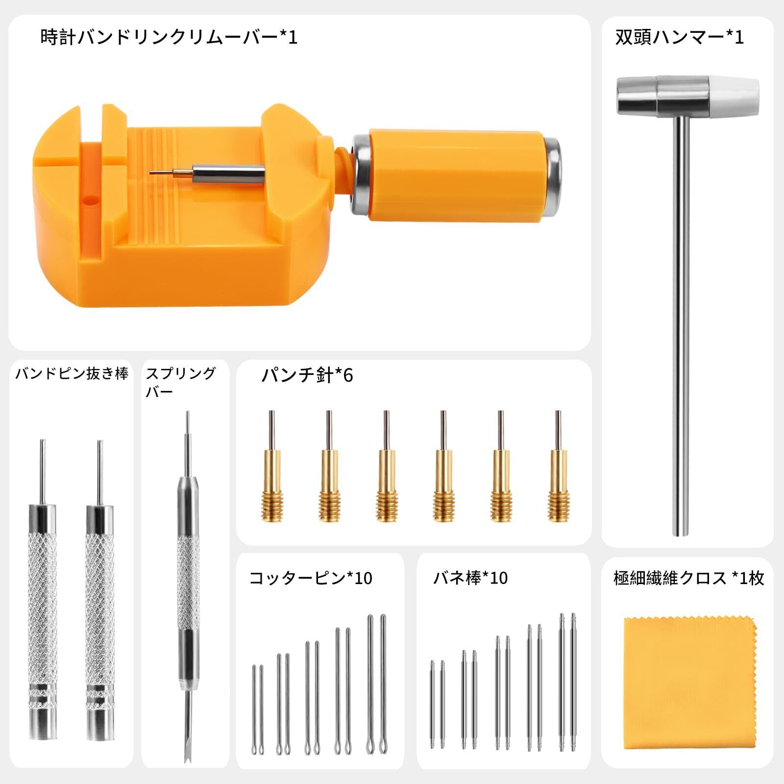 【セット内容】 双頭ハンマー*1 , 時計バンドリンクリムーバー*1,ウォッチスプリングバー *10 , コッターピン*10, バンドピン抜き棒*2, 極細繊維クロス *1枚,パンチ針*6, スプリングバーピンリムーバー *1。