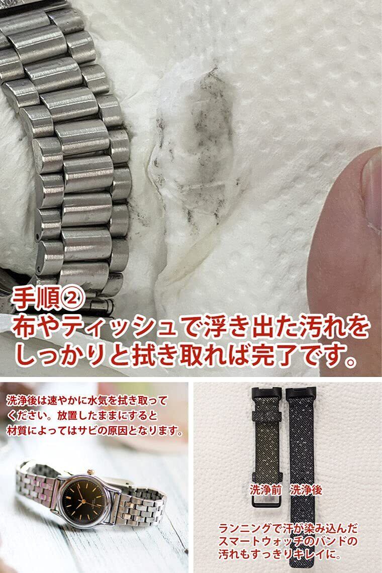 腕時計の金属ベルトや、金、銀、チタンなどの金属を洗浄できるスプレーです。使い方は非常に簡単。洗浄したい物の下に布やティッシュを敷き、洗浄したい箇所にスプレーし、30秒ほど経ったら拭き取るだけ。 しっかりと浮き出た汚れを拭き取ってからご使用ください。 洗浄後は速やかに水気を拭き取ってください。 放置したままにすると、材質によってはサビの原因となります。
