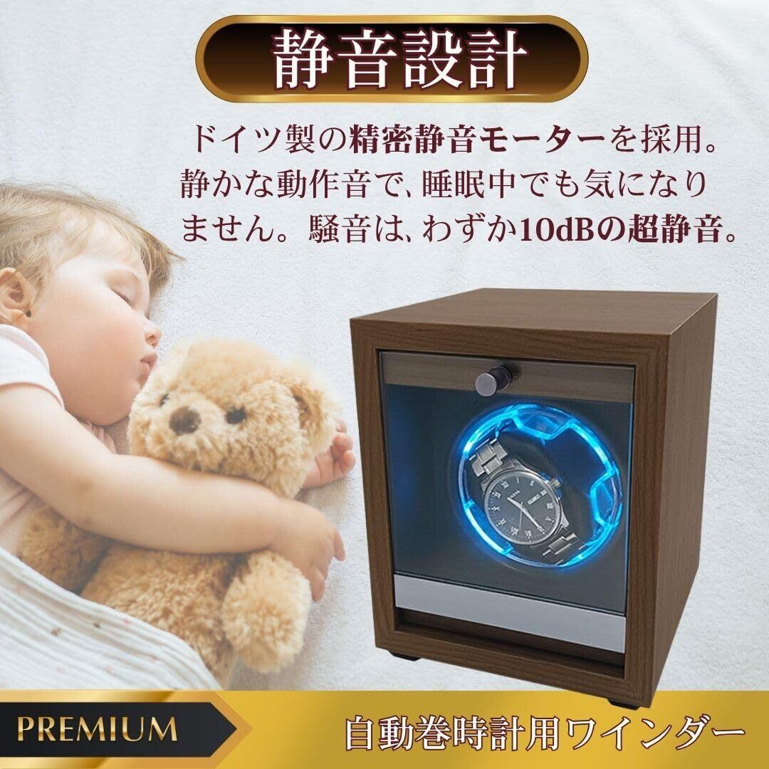高級デザイン: 上質な木製ケースとLEDライト付きの洗練されたデザインで、インテリアとしても美しい自動巻き上げ機です