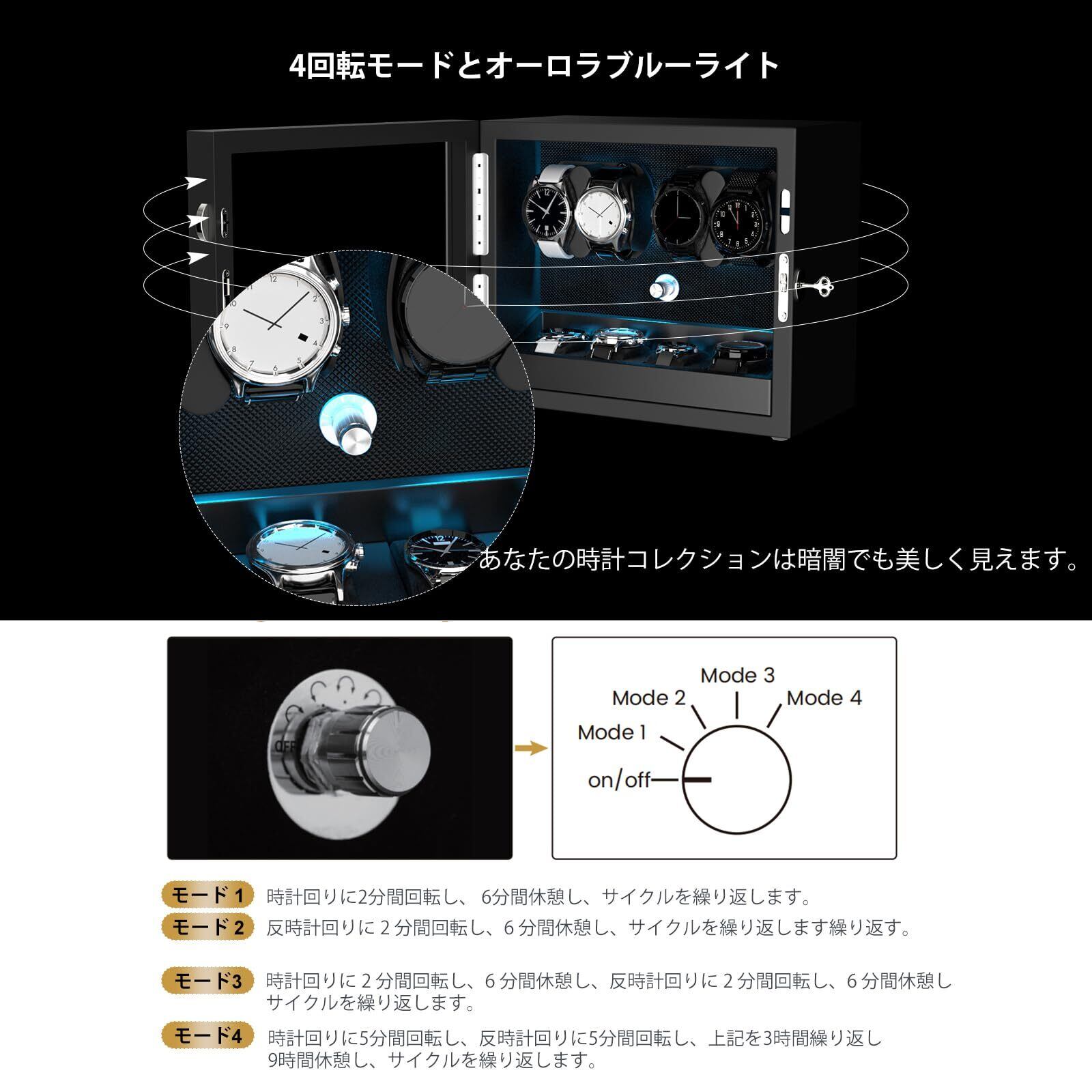 【4つの回転モード・内蔵LEDライト】4つの回転モードで様々な自動時計に対応します。順時針2分間と6分間停止、逆時針2分間と6分間停止、順時針と逆時針を交互に2分ずつ回転し6分間停止、順時針5分と逆時針5分を交互に繰り返し3時間運転した後9時間停止します。内蔵のLED照明により、暗い場所でも素早く時計を確認できます。
