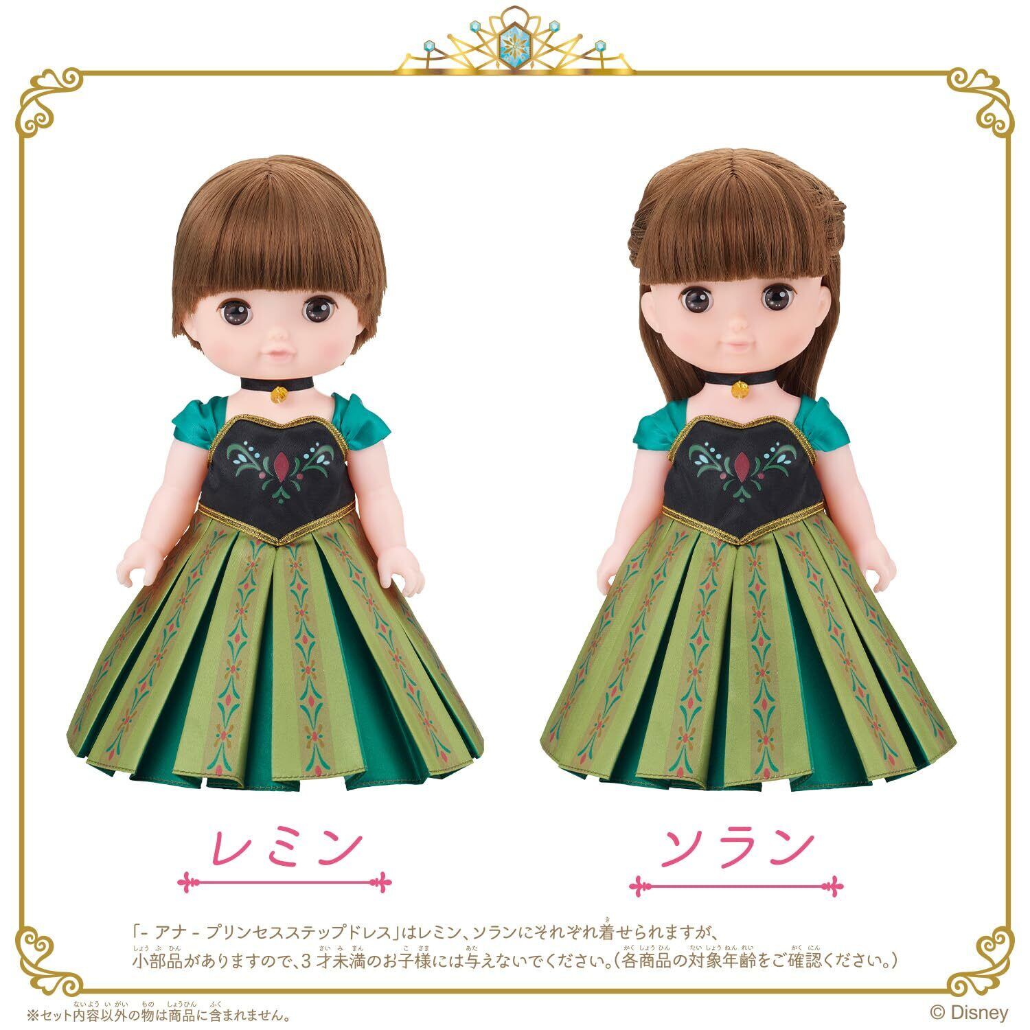 「ーアナー プリンセスステップドレス」はレミン、ソランにそれぞれ着せられますが、小部品がありますので、3歳未満のお子様には与えないでください。