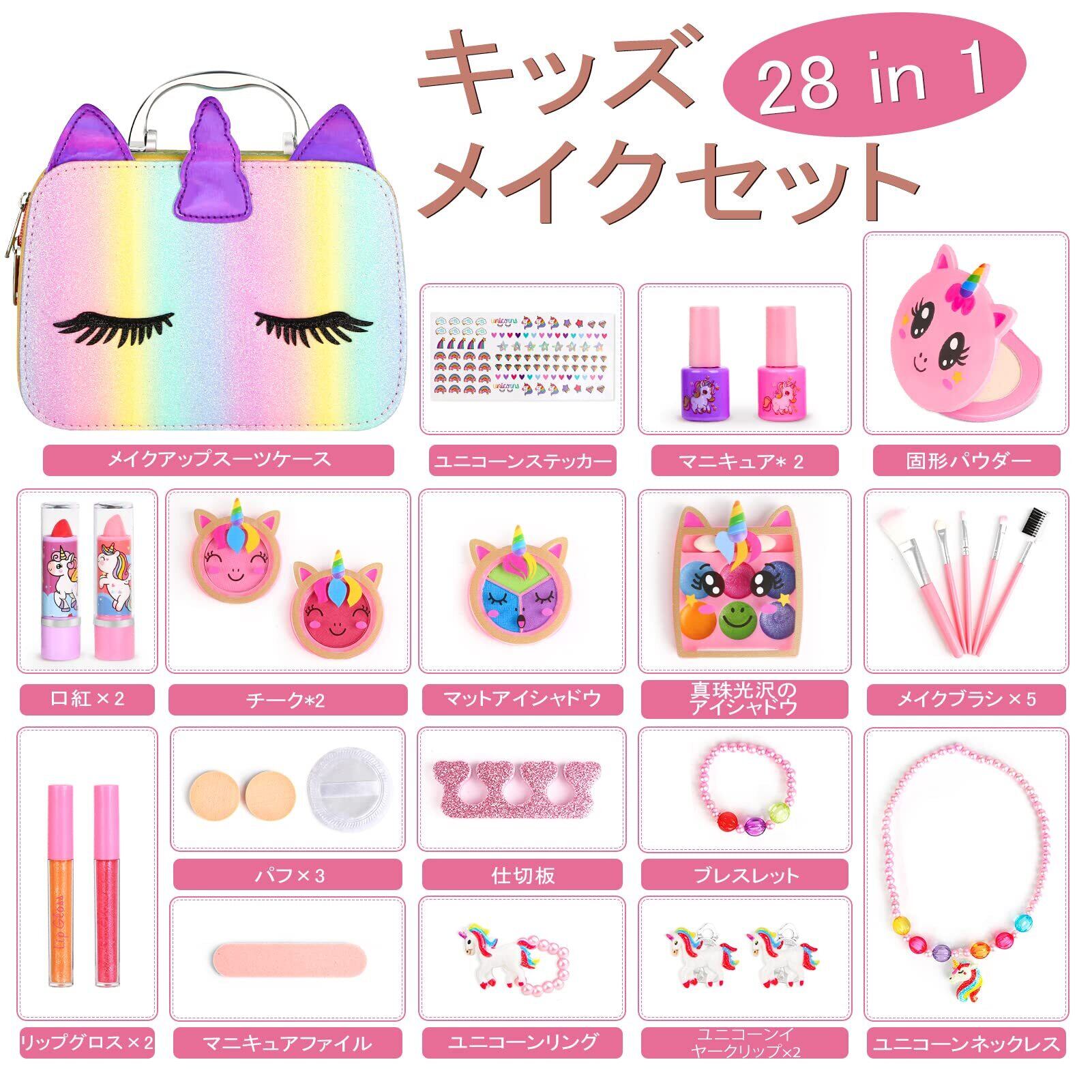 [28 IN 1 メイクセット おもちゃ 女の子]: 女の子用メイクアップ キットには、すべてのステップが含まれています: 口紅、リップ グレーズ、チーク、アイ シャドウ、パウダー、パフ、メイク ブラシ、マニキュア、ネイル ファイル。そのほか、女の子が好きなユニコーン柄やユニコーンステッカー、ユニコーンのコスメバッグなども。