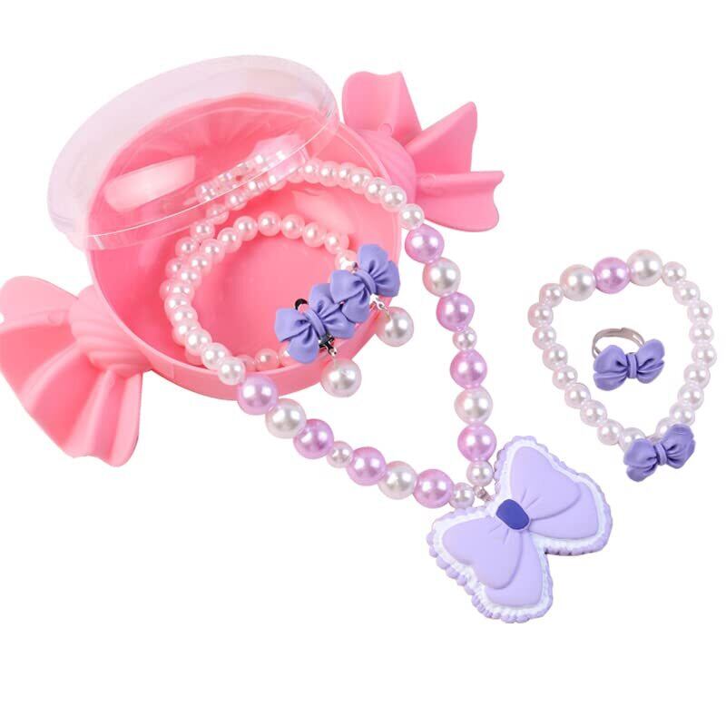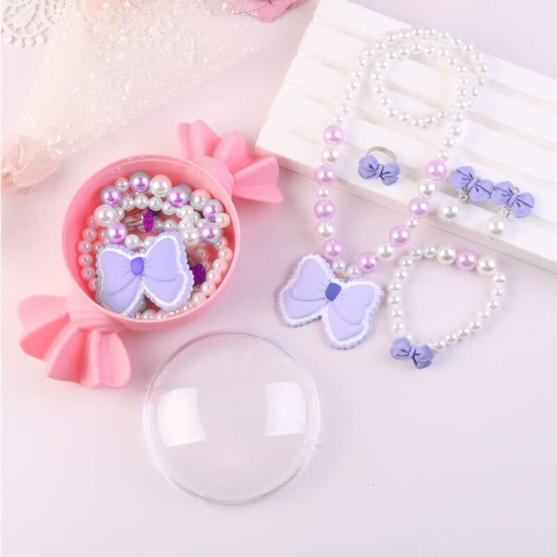 【デザイン】:キャンディ型アクセサリーケースセット-紫蝶結び目【サイズ】:10*10*2cm 【製品の内容】:合計5点セット(ネックレス*1+ブレスレット*1+指輪*1+イヤリング*2)