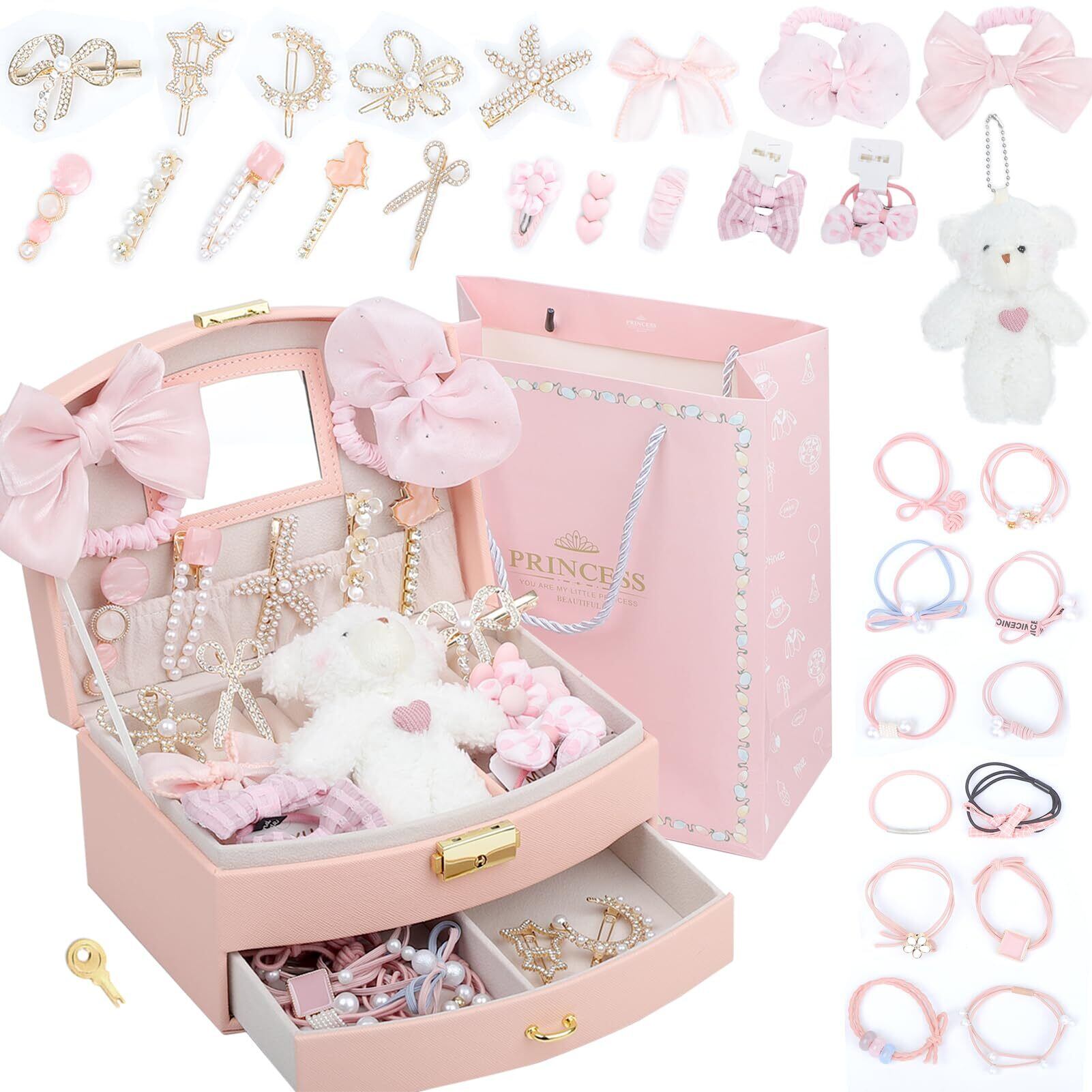 ヘアアクセサリーセット かわいい 収納ボックス付き 女の子プレゼント 大容量 プリンセス アクセサリーセット ヘアクリップ ヘアゴム 入園式 入学式 卒業式 子供の日 七五三 誕生日 クリスマス 女の子ギフト お姫様 小学生 プレゼント (ピンクセットA)