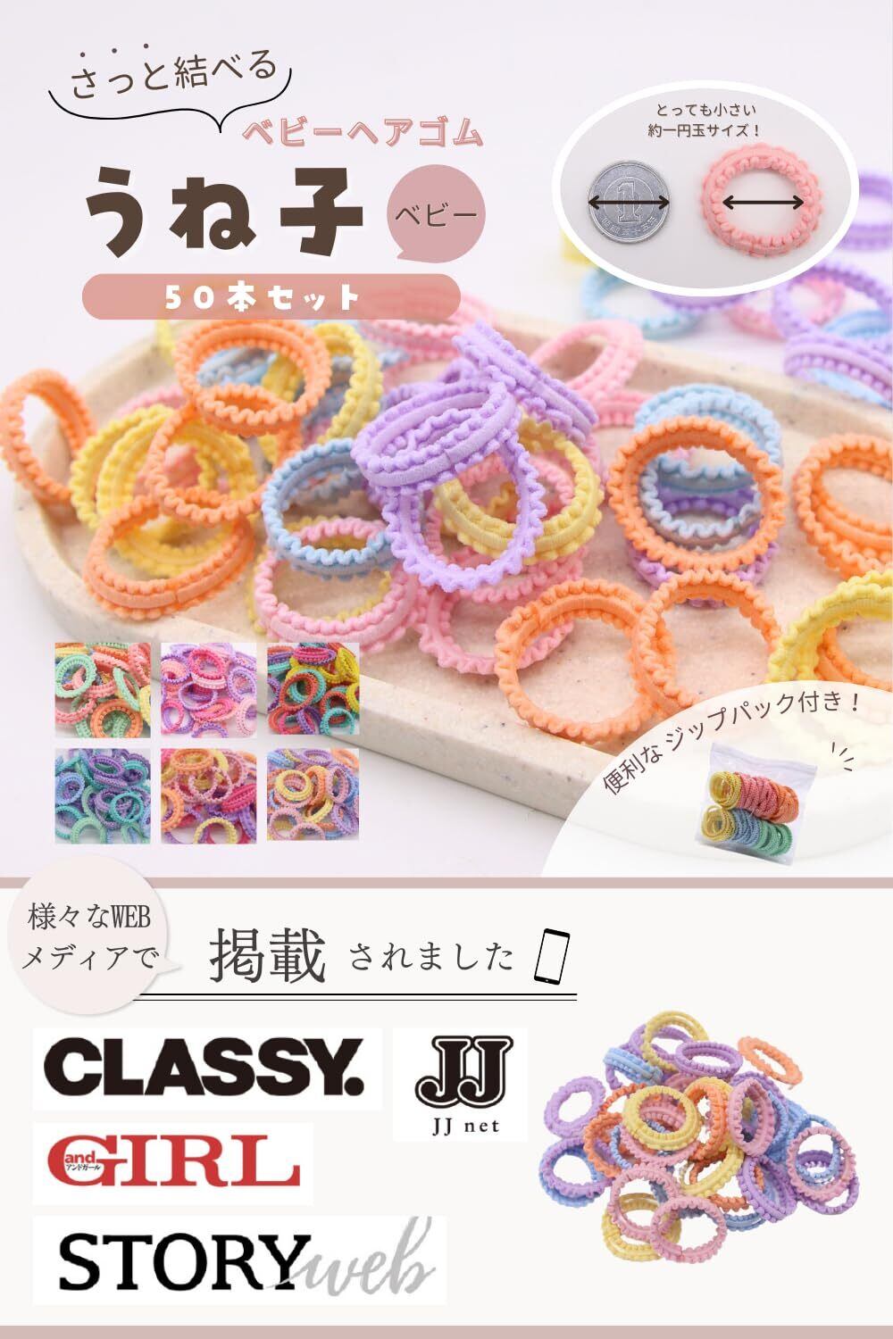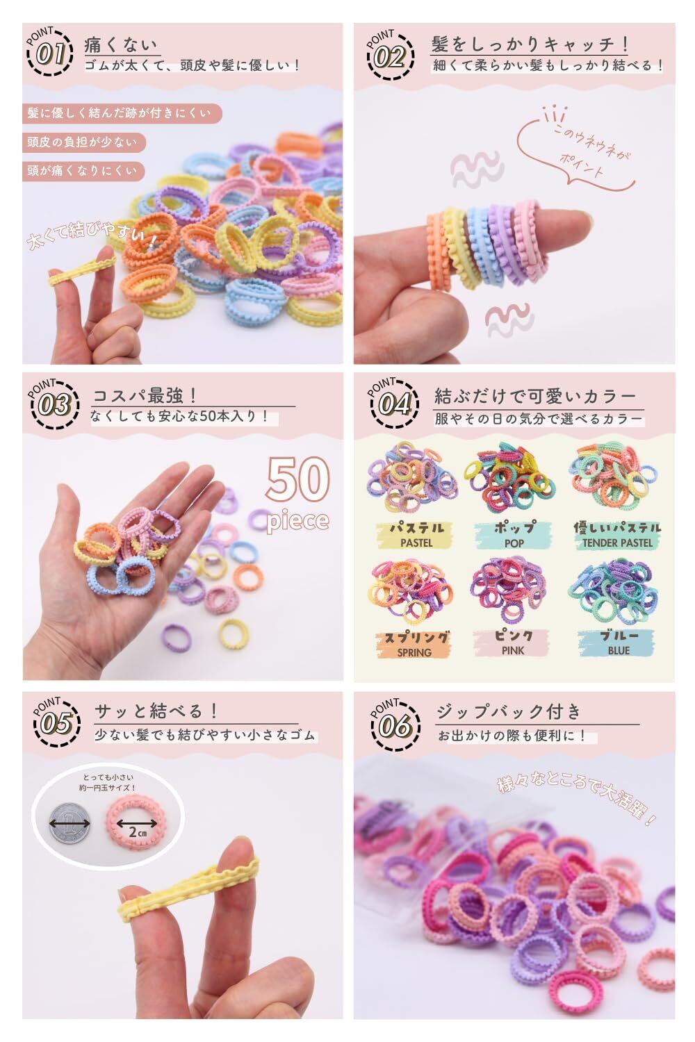 【商品仕様&セット内容】 ゴム直径:約2cm、50本セット。髪の少ないお子様でもしっかり結べる仕様で、毎日のヘアアレンジに大活躍します。