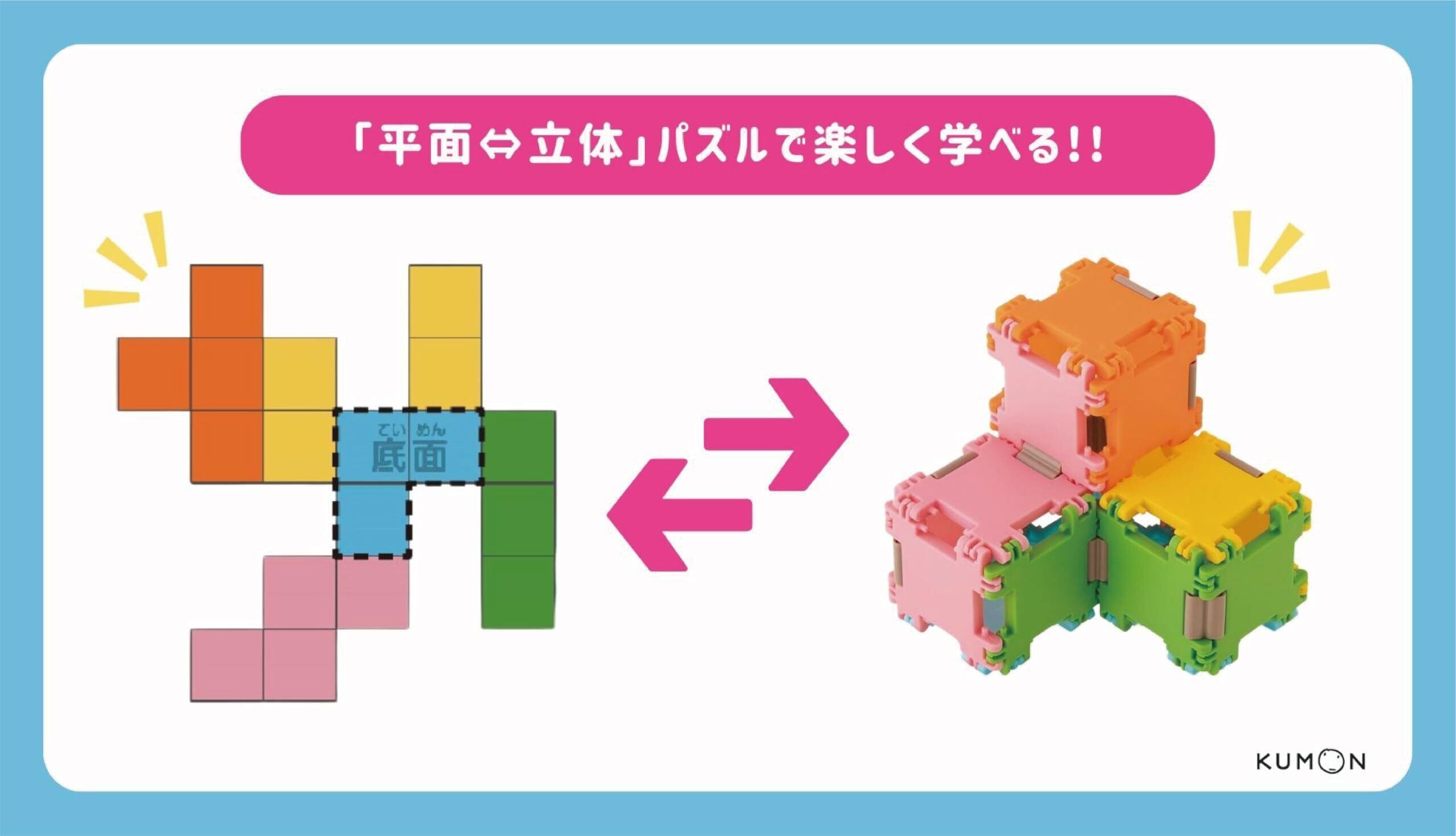 展開図を考えて組み立てるパズルで、立体図形に強くなる。
