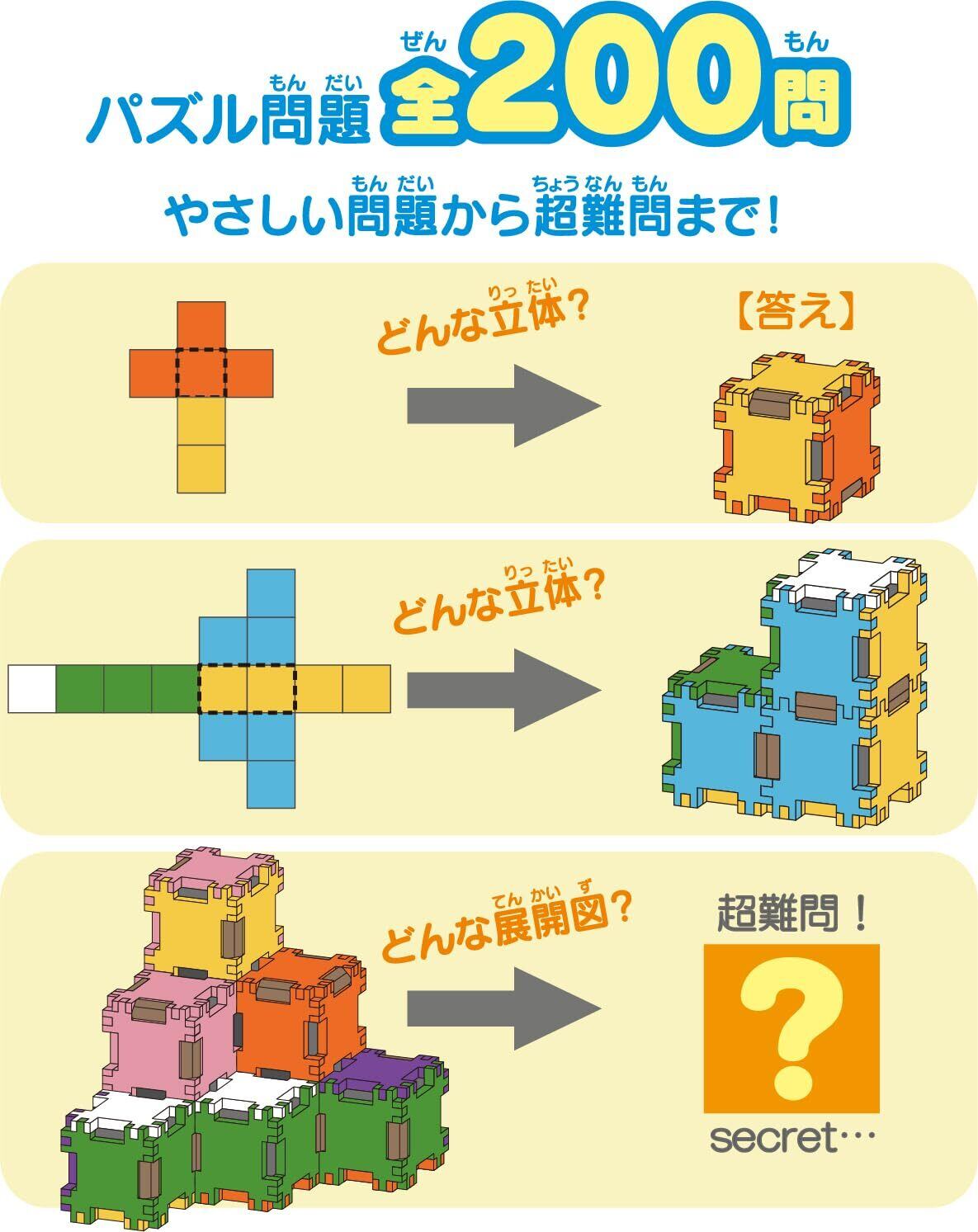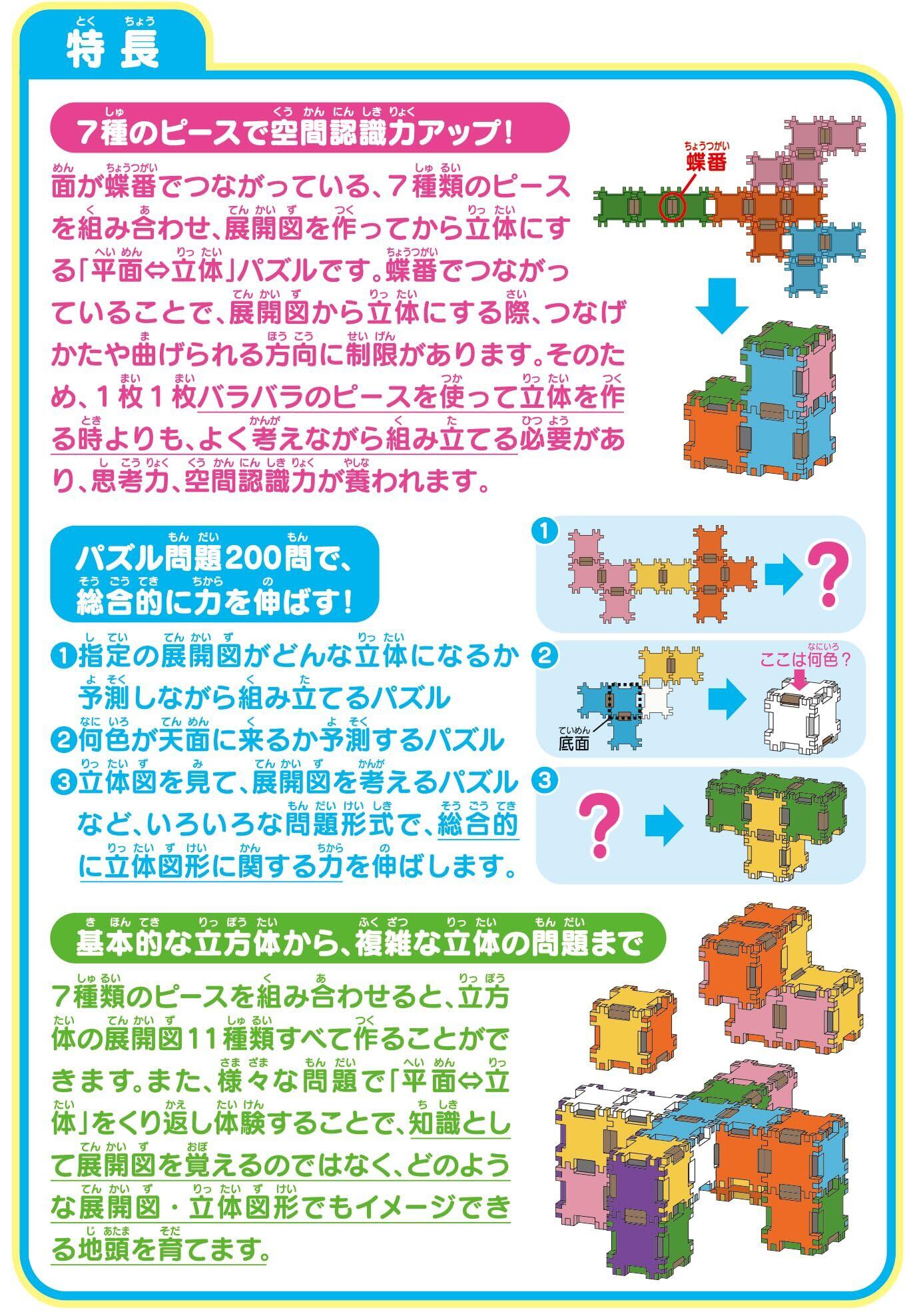 セット内容:展開図ピース:合計24枚(黄色4枚、青3枚、緑3枚、紫2枚、ピンク2枚、オレンジ2枚、白4枚)、取りはずし棒:1本、問題集:1部