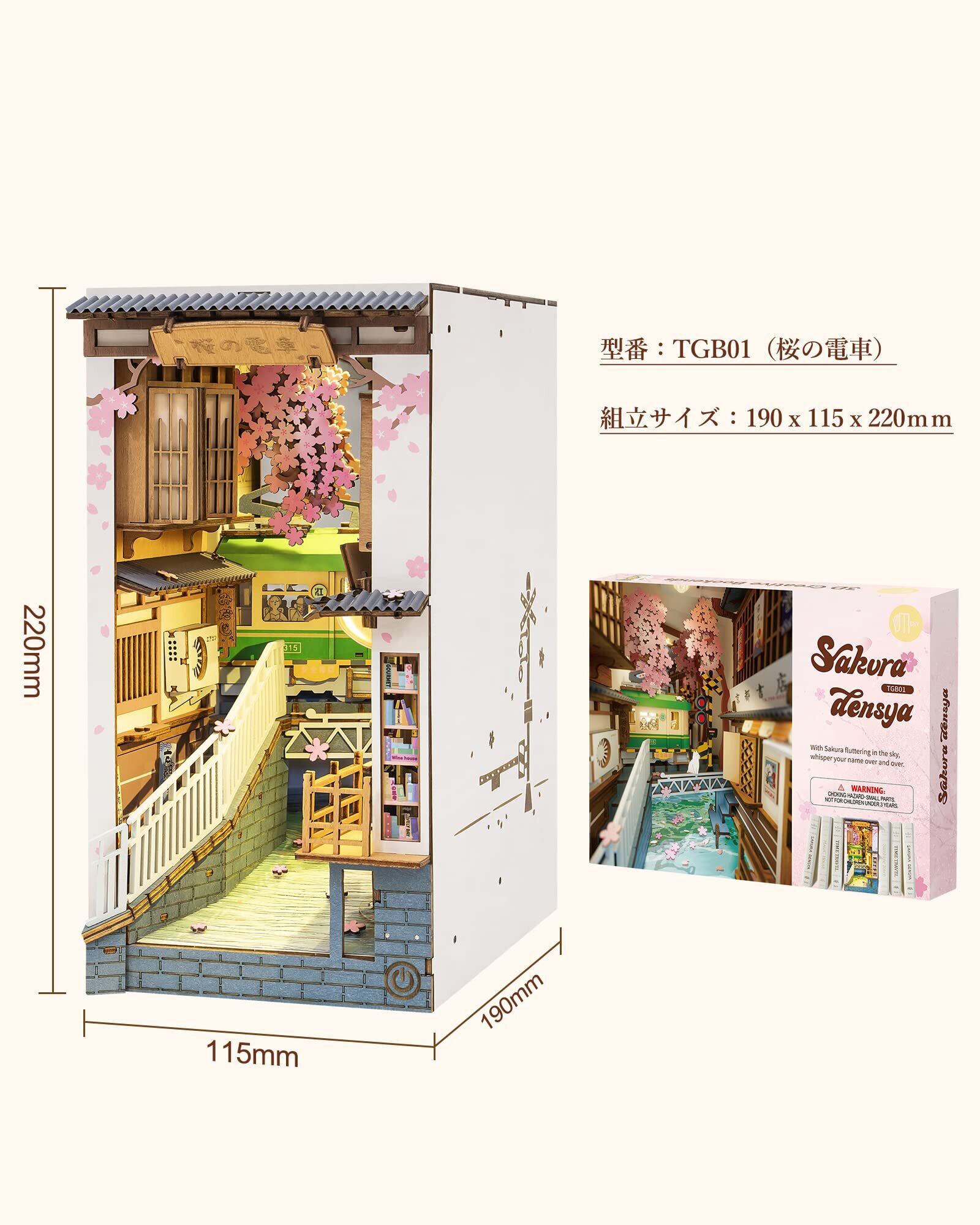 ROBOTIME ブックヌック キット 立体パズルで作る「桜の電車」- 桜咲く駅の世界を再現!LED内蔵 3Dウッドパズル ブックヌックシリーズ 本立て ブックエンド機能付き 大人も子供も楽しめる木製ミニチュア キット 和風 インテリア雑貨 手作り DIY クラフト 誕生日 記念日プレゼントに最適