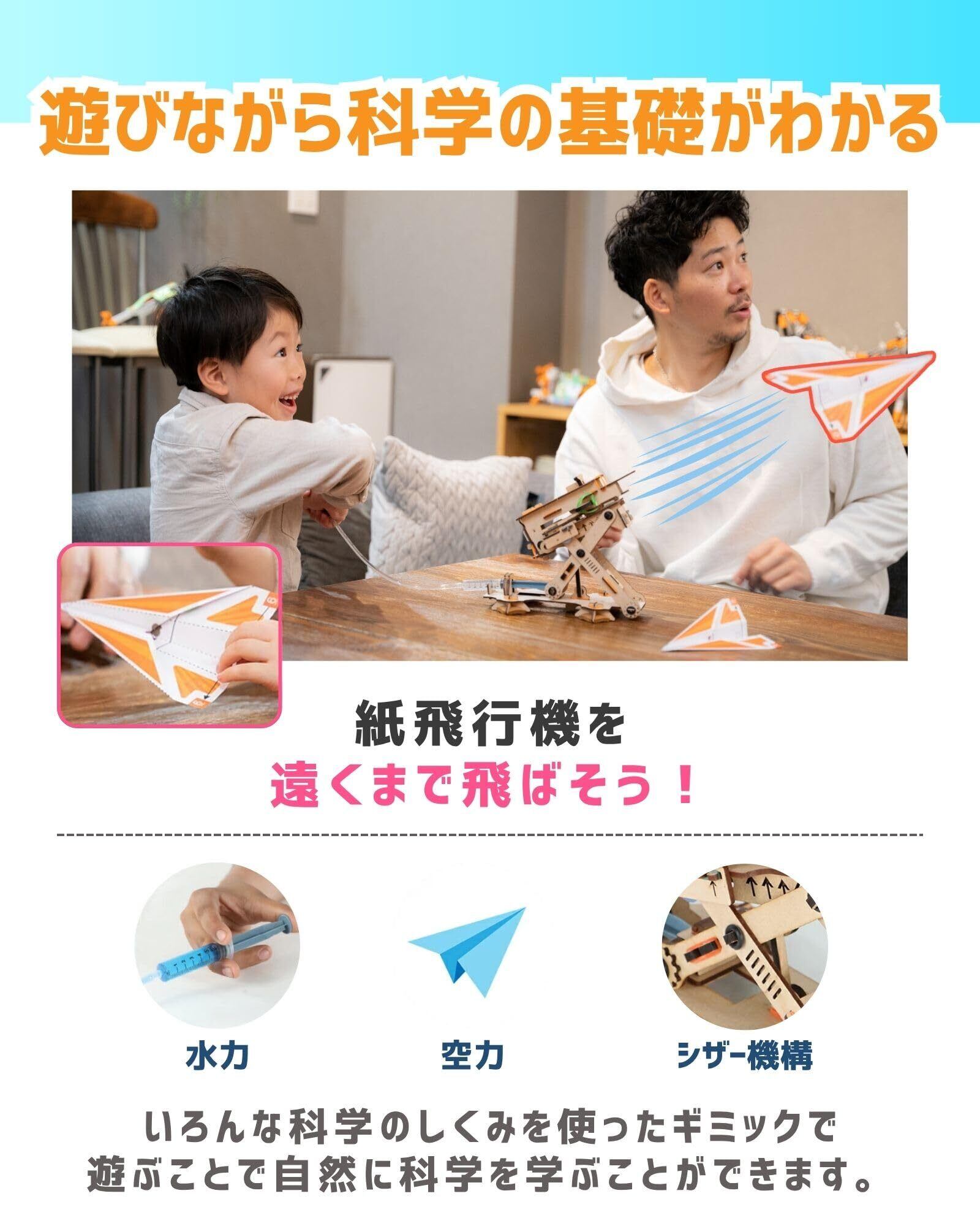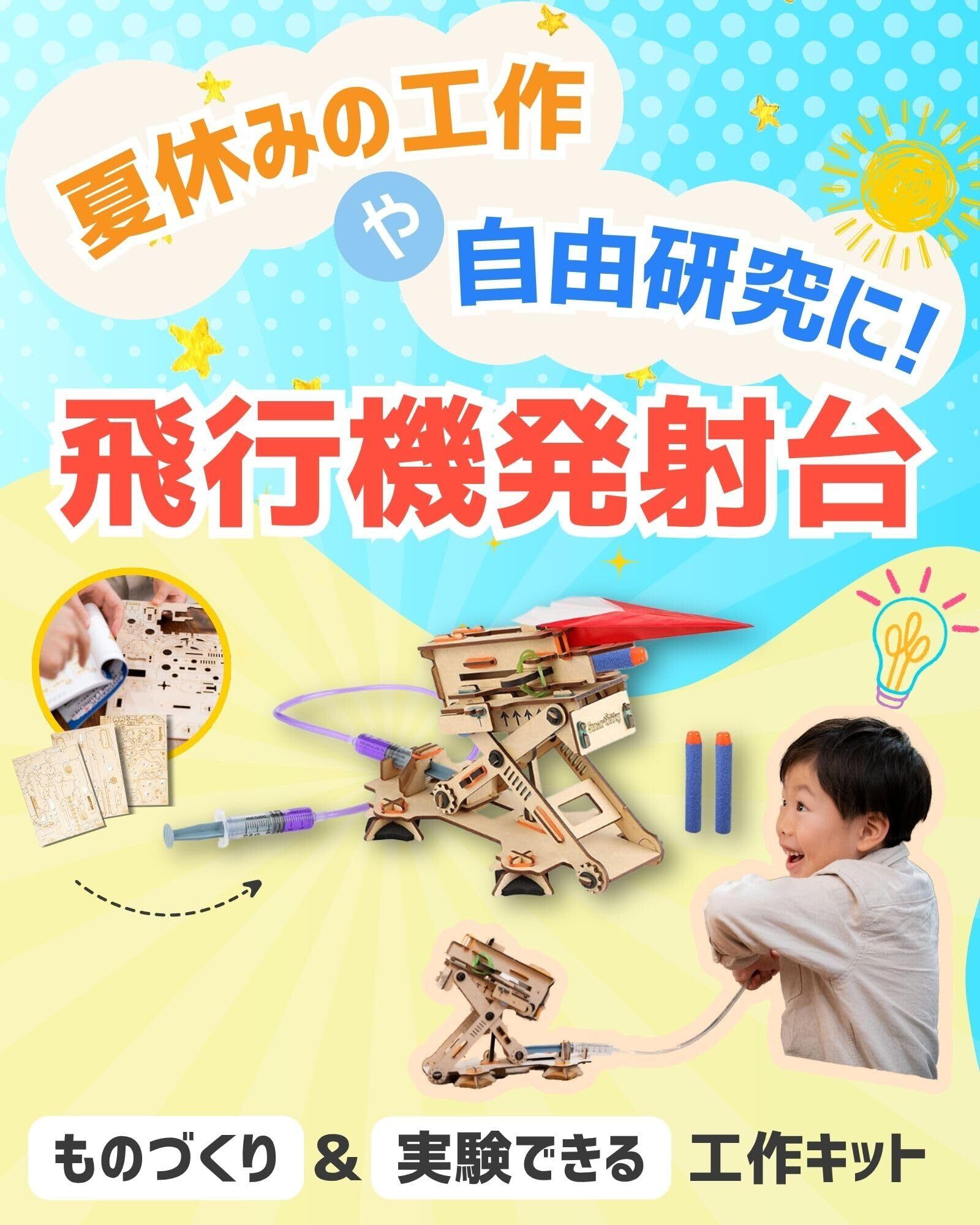 【科学の基礎を作って学べる工作キット 夏休みの自由研究に】ノリやテープなどの器具は一切不要で、パズルのように発射台を組み立てて紙飛行機を飛ばす「遊び」と、飛ぶ仕組みを理解していく「学び」を融合した遊んで学べる「飛行機発射台」。油圧システムの概念を用いて水の力で紙飛行機を勢いよく発射することができるので、遊びながら航空力学や油圧システム、シザー構造など学べます。普段の遊びに知育玩具を取り入れることで「遊び」=「学び」に。