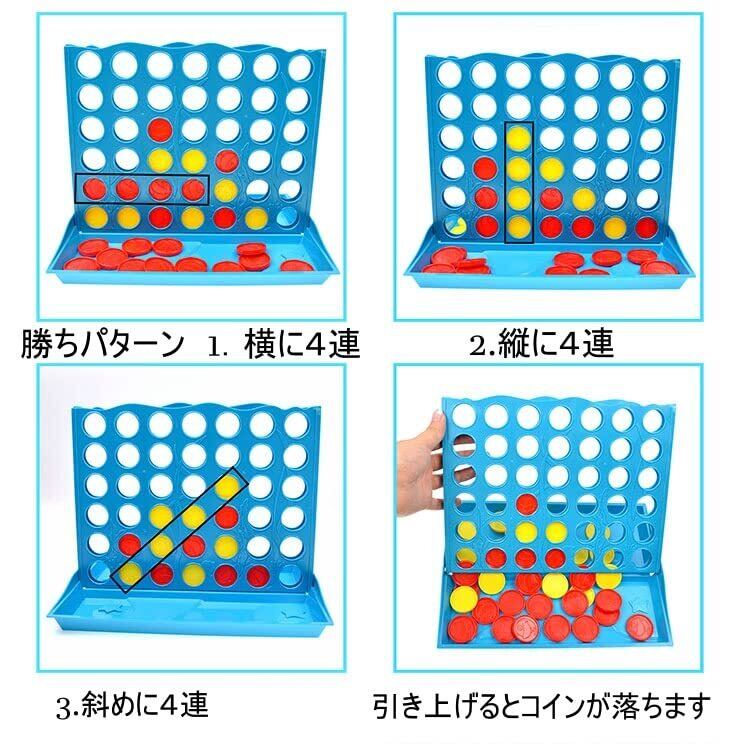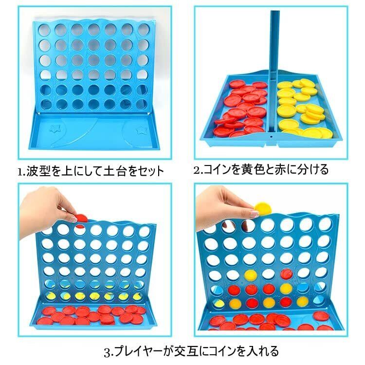 ・交互にコインを投入し、縦・横・斜めに4連を先に完成したほうが勝ちというシンプルなゲームです。コインは赤・黄色それぞれ20枚入りです。