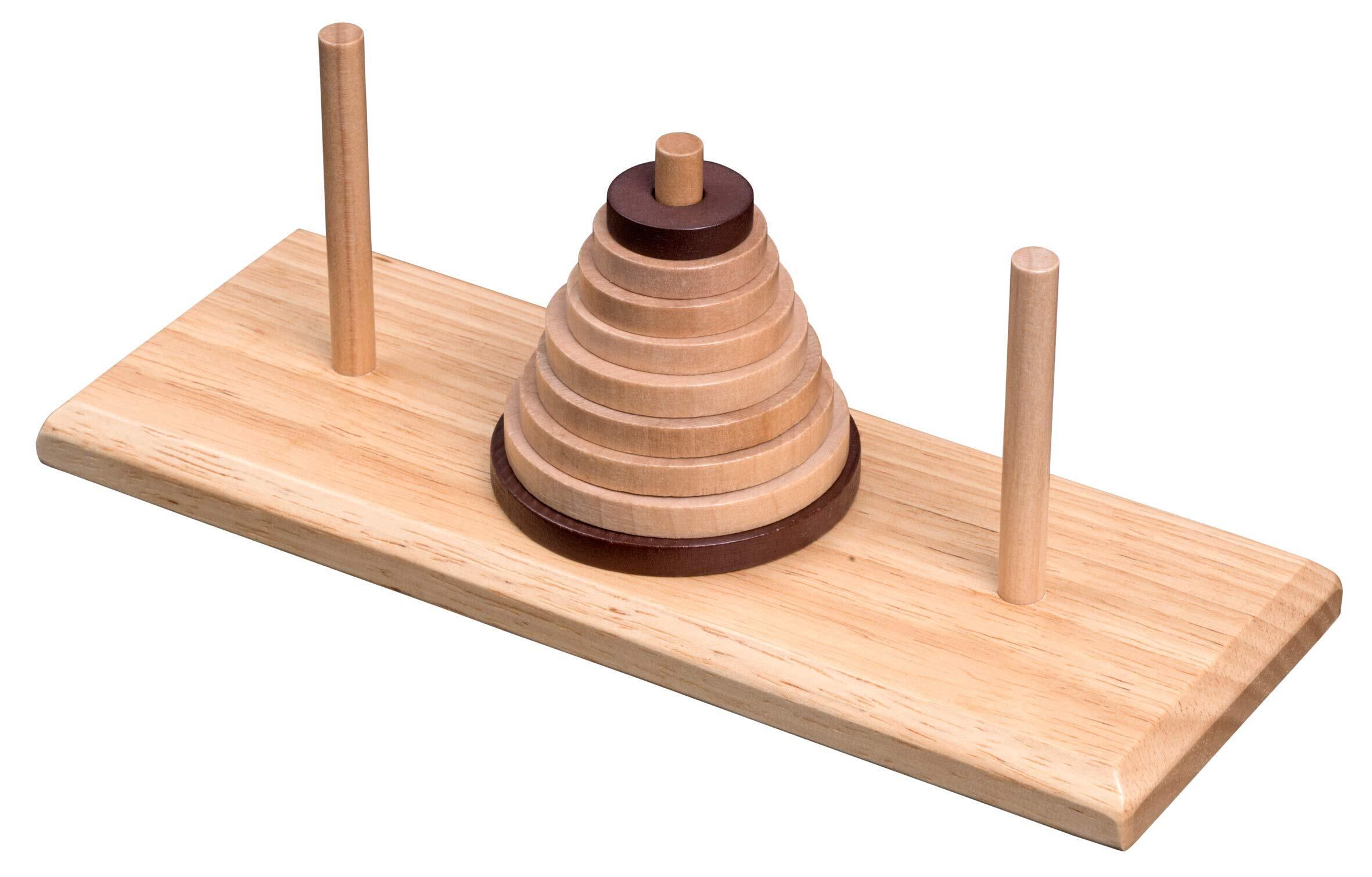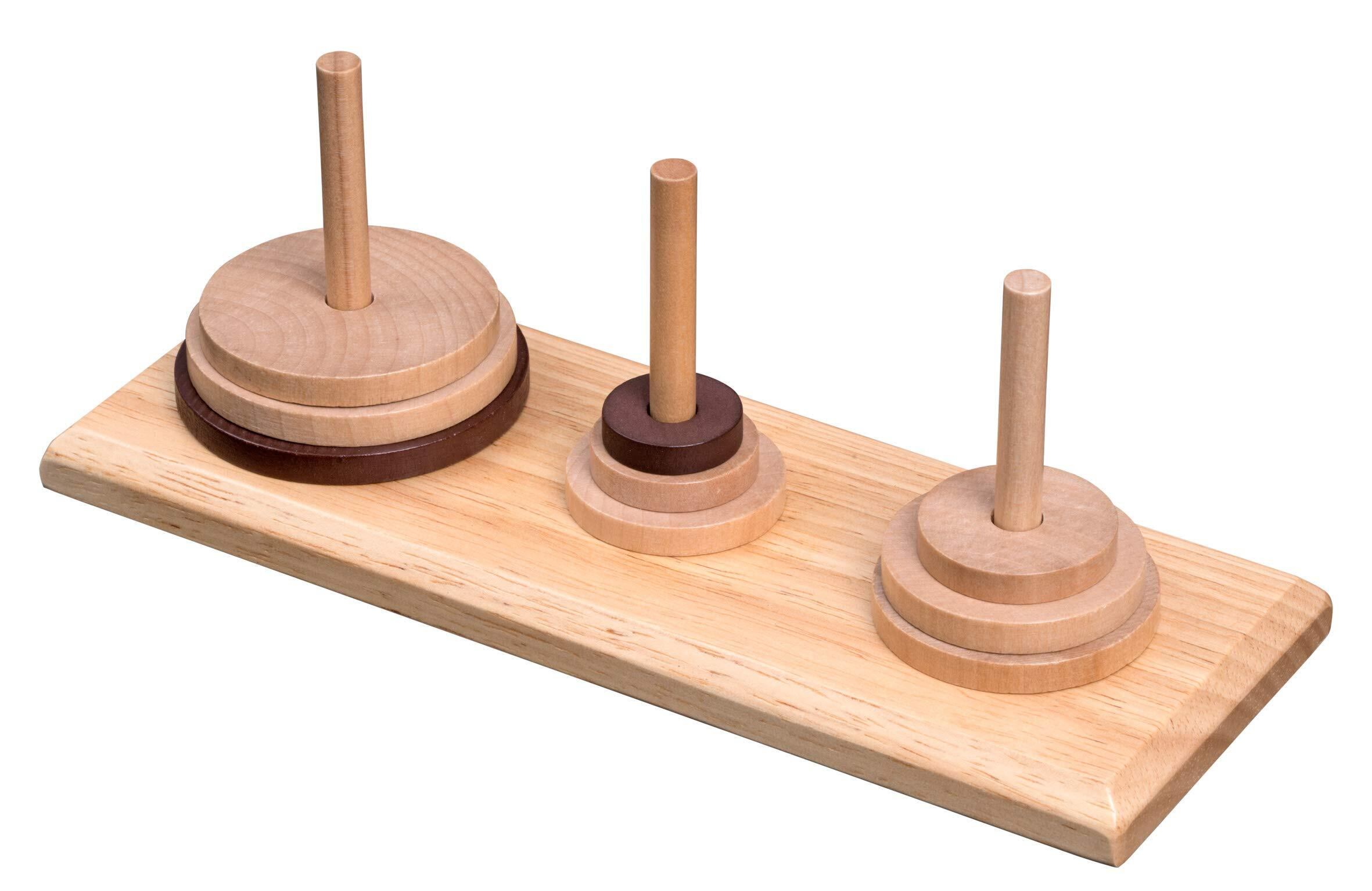 ルールに従ってすべての円盤を右端の杭に移動させていくゲームです。約120年前に考案された、シンプルですが奥深いゲームです。