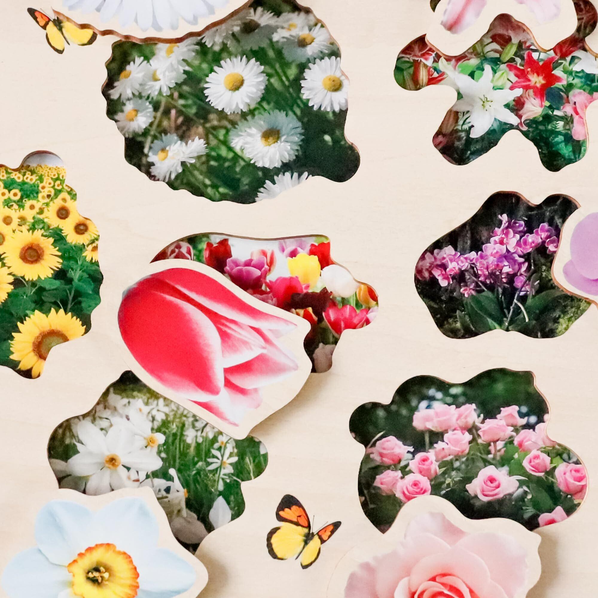 学習と発達: 教師と保護者が設計した知育パズル。各ピースの下にカラフルなイラストが描かれており、きのこ、木、花を楽しく学べます。微細運動能力や問題解決能力を育む幼児向けマッチングゲームです。