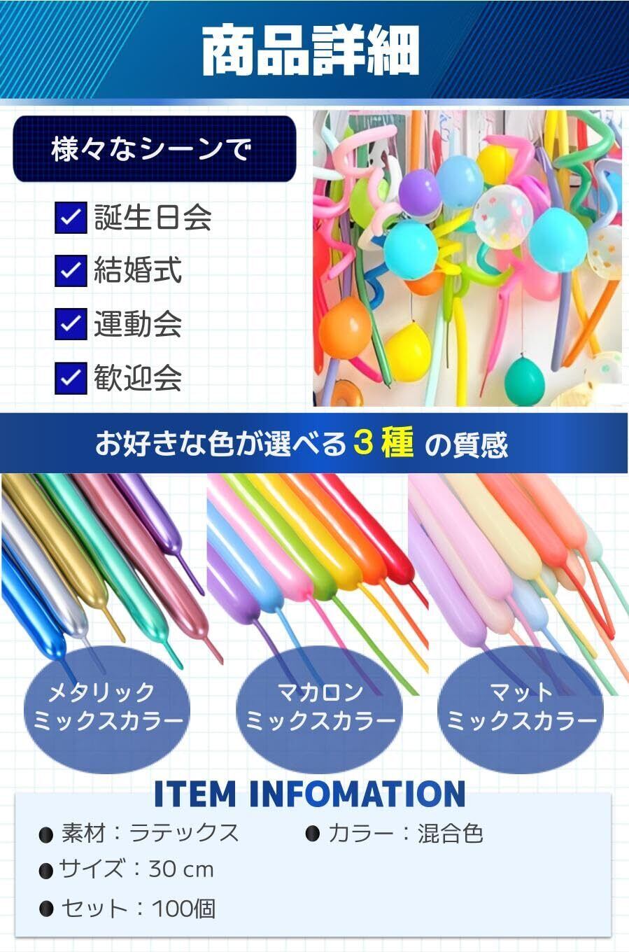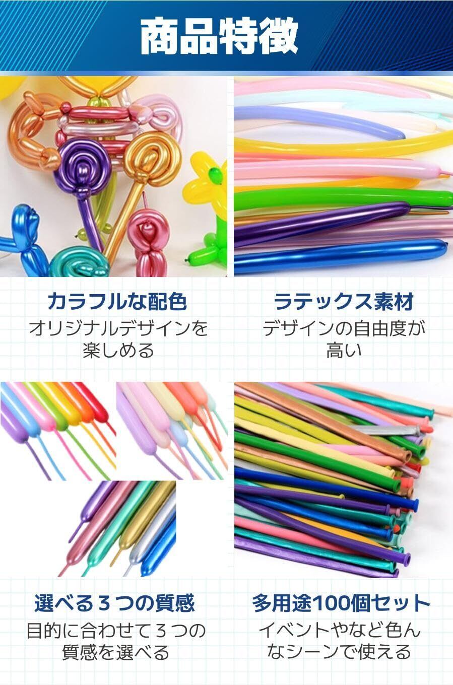 【商品特徴】①カラフルな配色:オリジナルデザインを楽しめる/②ラテックス素材:デザインの自由度が高い/③選べる3つの質感:目的に合わせて3つの質感を選べる/④多用途100個セット:イベントやなど色んなシーンで使える