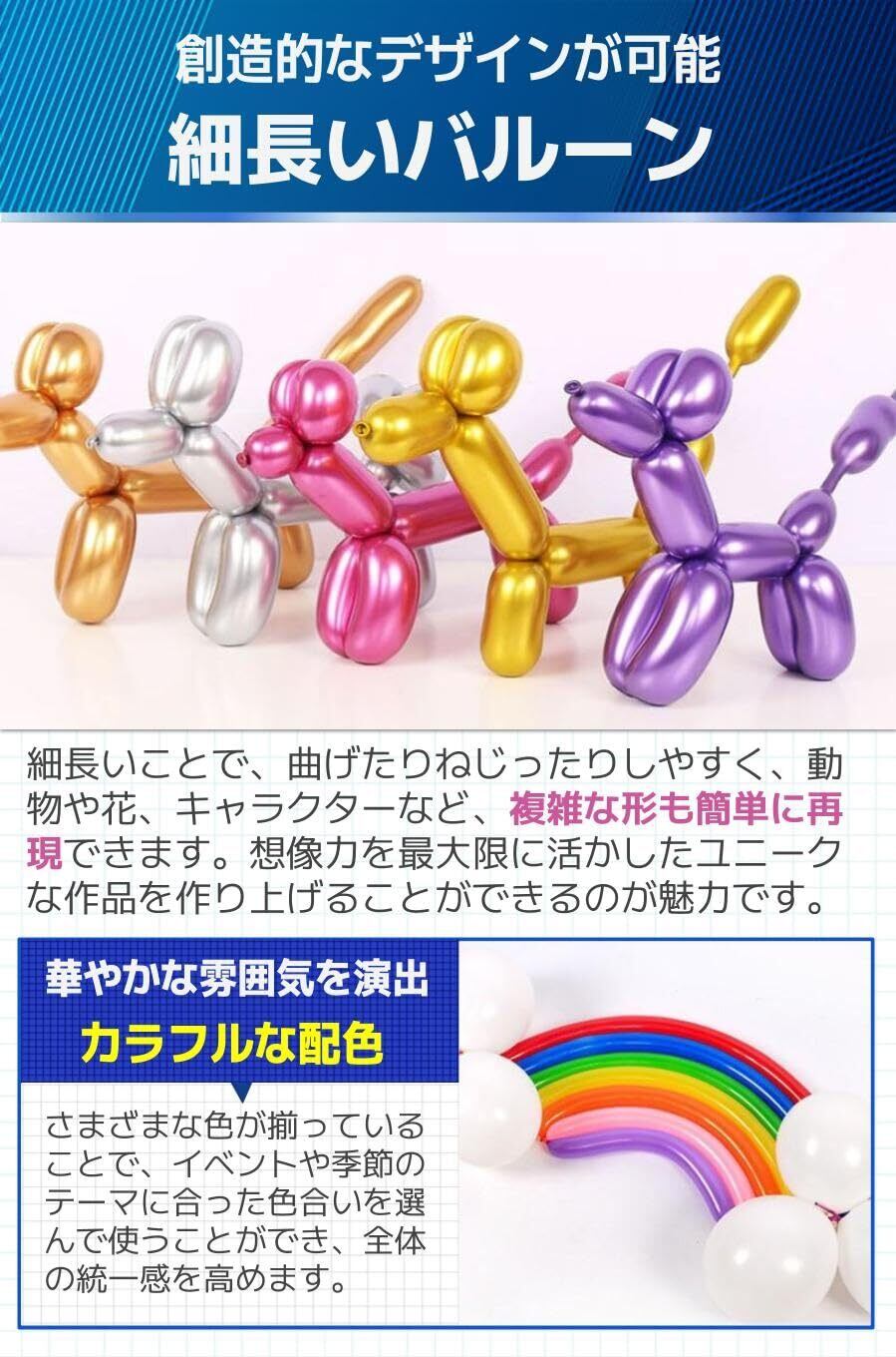 【細長いバルーン】細長いことで、曲げたりねじったりしやすく、動物や花、キャラクターなど、複雑な形も簡単に再現できます。想像力を最大限に活かしたユニークな作品を作り上げることができるのが魅力です。