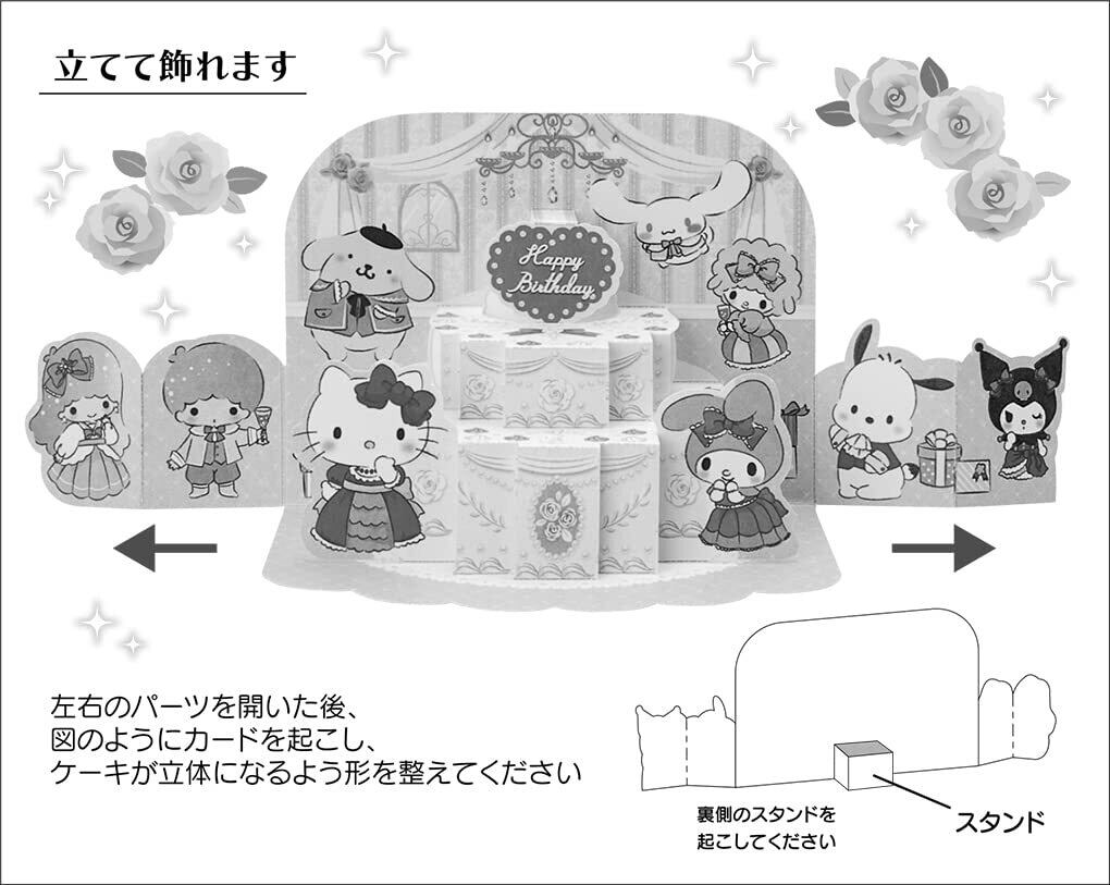 ・飾ったサイズ:27.3x9.6x8cm ・立体カード ・カードを起こすと、バースデーパーティーを楽しむキャラクターたちと、かわいいケーキが立ち上がります。いつもとは違い、おしゃれをしたキャラクターたちの衣装がポイントです! 立てて飾れます。カードの裏側にメッセージスペースがあります。 ・郵便料金(国内)は120円です。 ・© 2022 SANRIO CO., LTD.