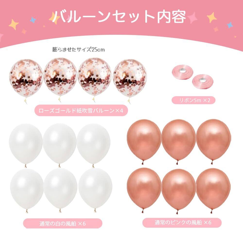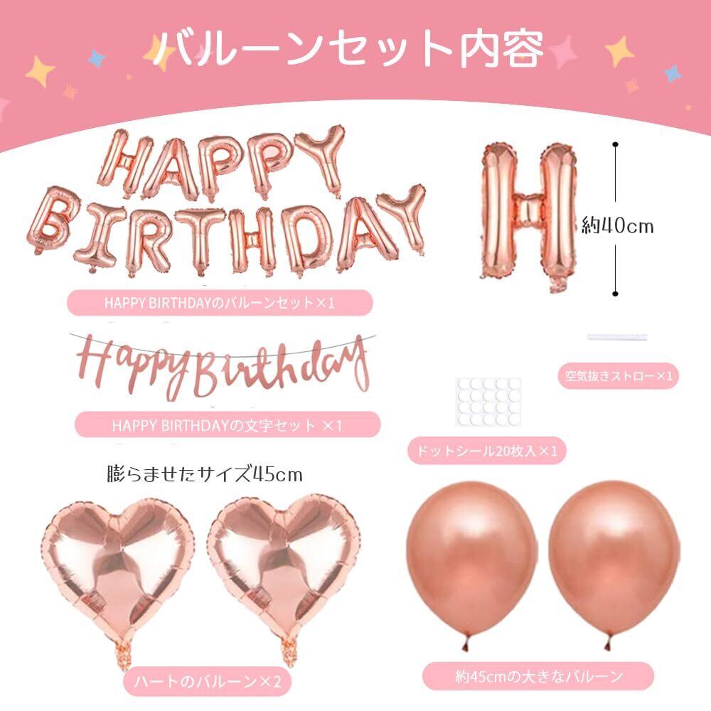 【セット内容】HAPPY BIRTHDAYの文字バルーン一式×1、HAPPY BIRTHDAYガーランド(ピンクゴールド)×1、約45㎝ハートの風船(ピンクゴールド)×2、大きなピンクの風船×2、普通サイズのピンクの風船×6、普通サイズの白の風船×6、ピンク紙吹雪入り風船×4、ドットシール×2、リボン×2、ストロー×1