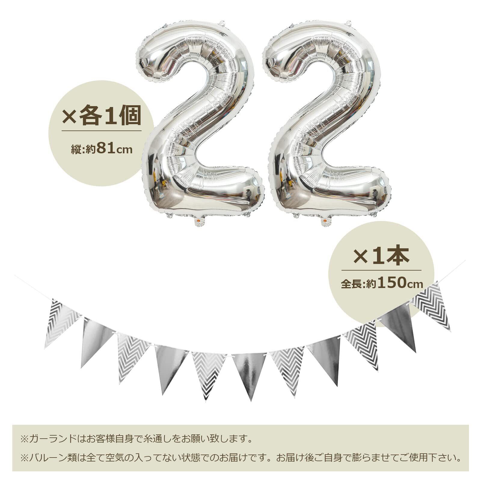 〔豪華なセット内容〕「22」数字バルーン×各1個、フラッグガーランド×1本、HAPPY BIRTHDAYガーランド×1本、紙吹雪入りバルーン×5個、ホワイトバルーン×10個、ブラックバルーン×10個、おまけ:リボン×1個、ドットシール×1枚。※商品の取り扱いは6才以上のお子様にお勧めします。ガーランドはお客様自身で糸通しをお願い致します。バルーン類は全て空気の入ってない状態でのお届けです。お届け後ご自身で膨らませてご使用下さい。