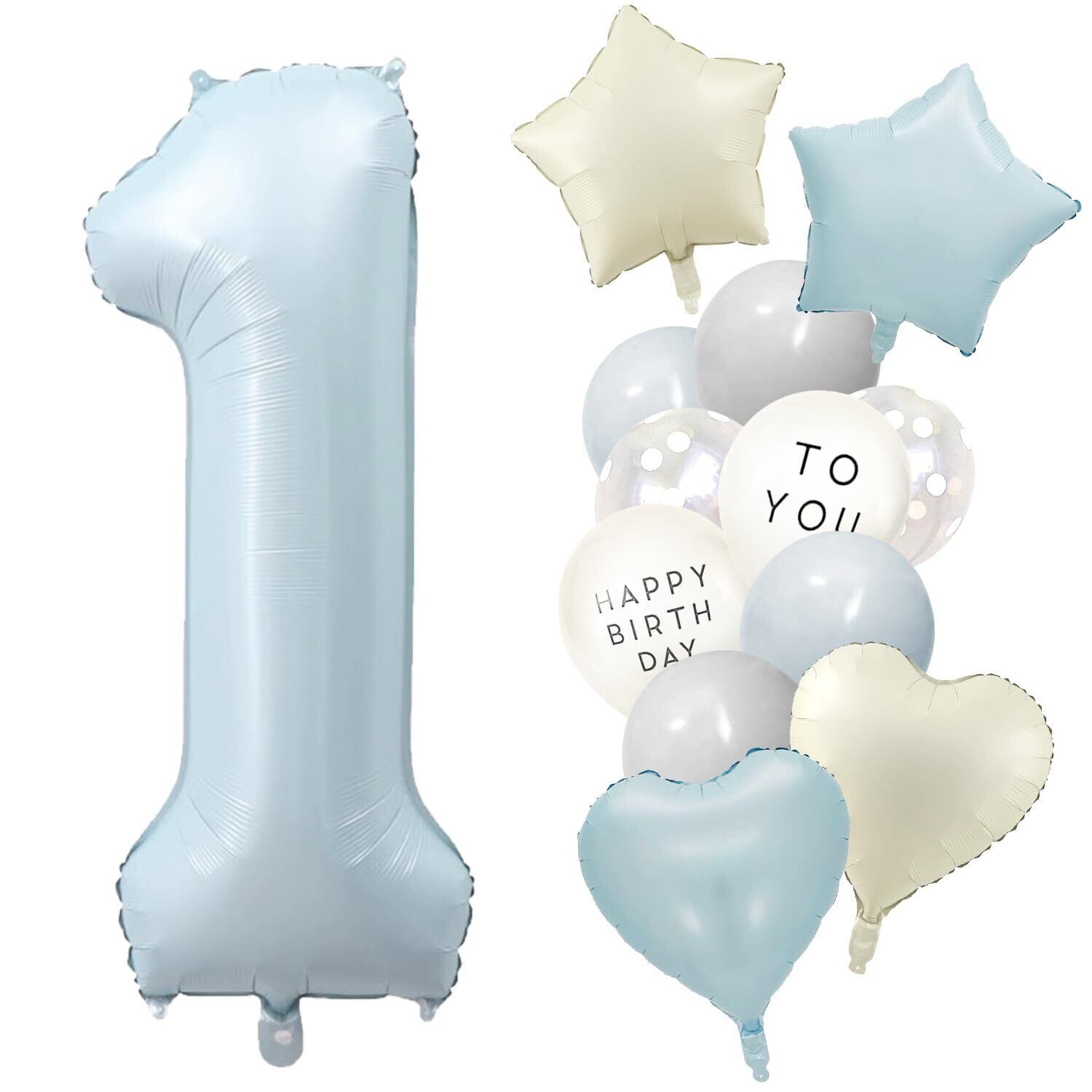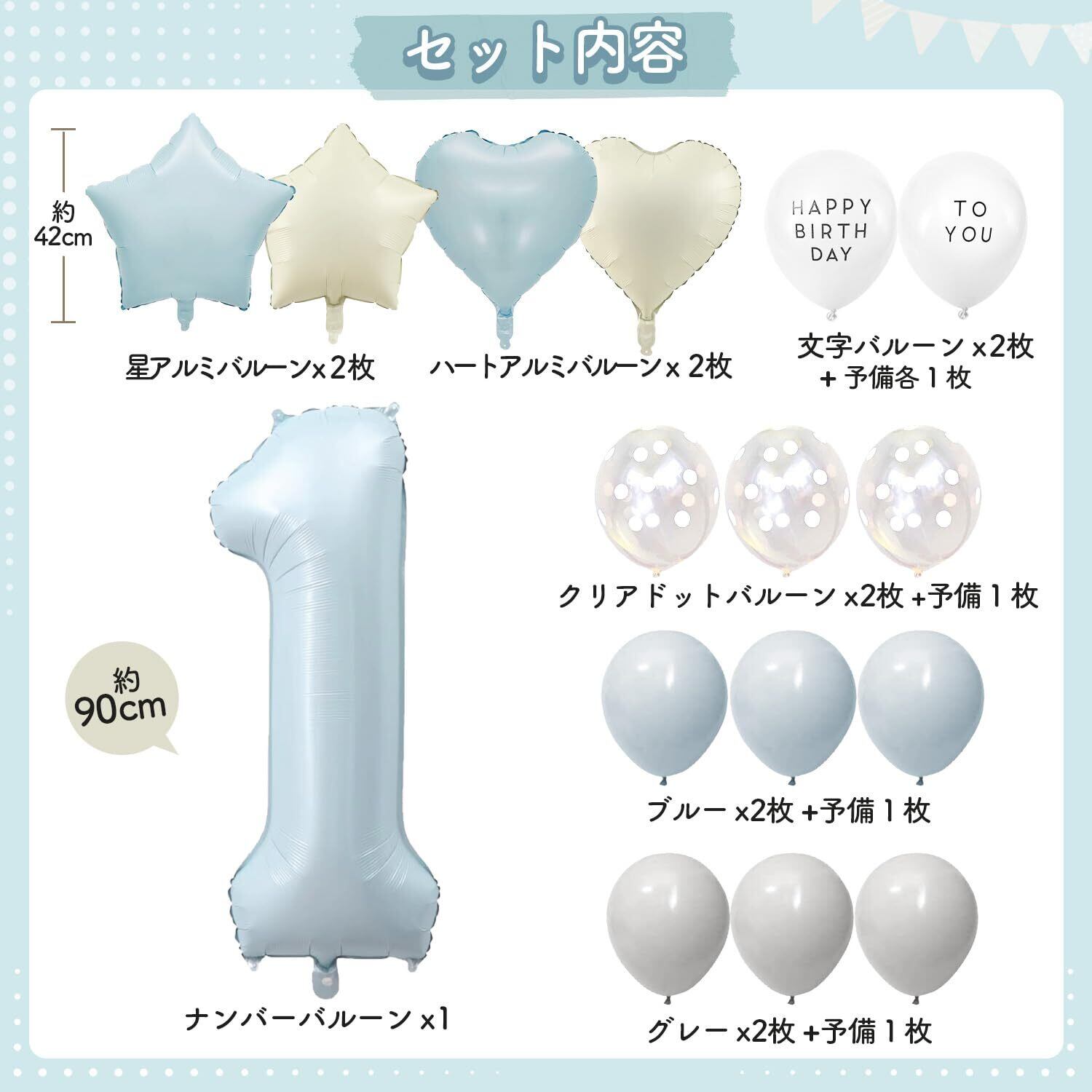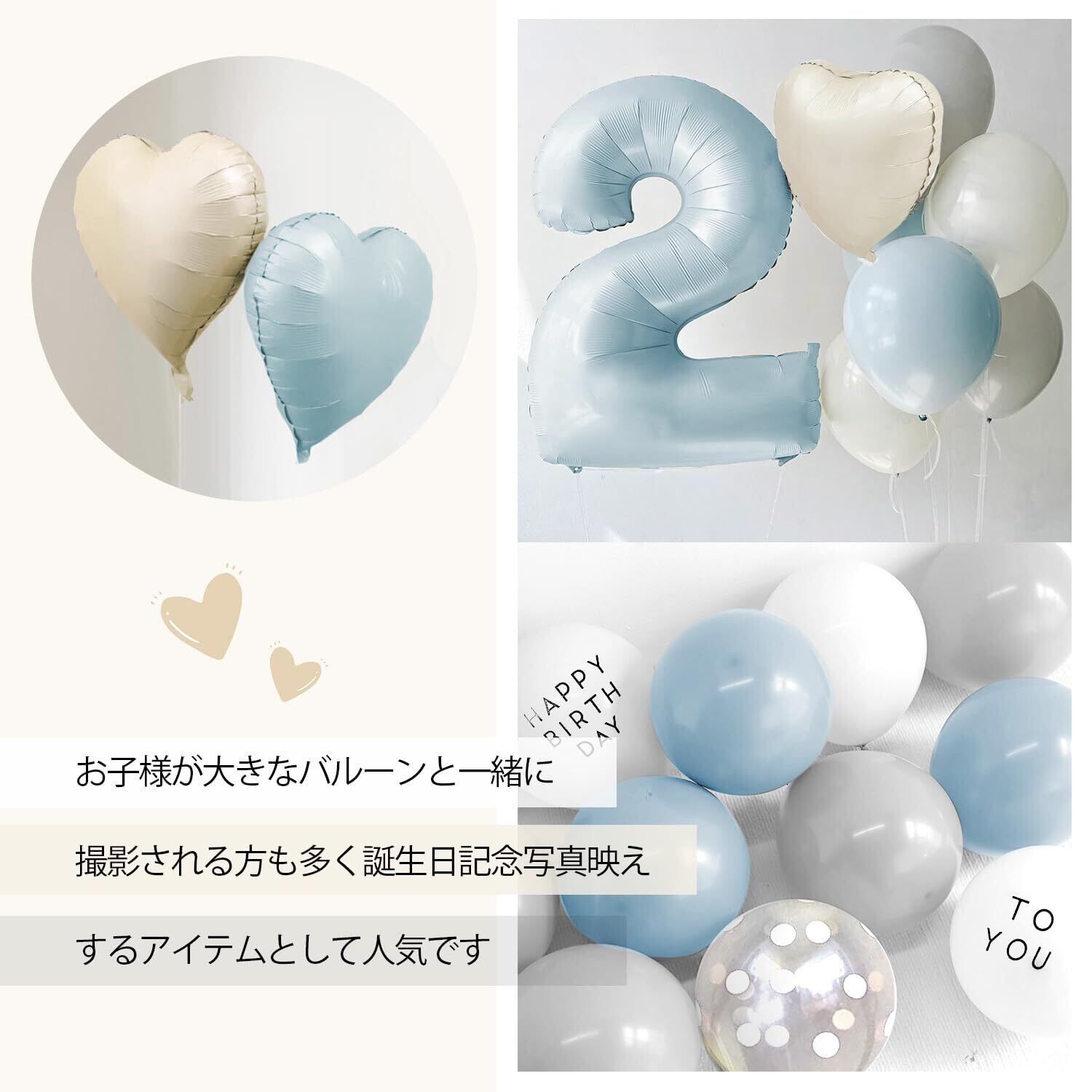 【豊富な23点セット】①くすみブルーナンバーバルーンx1(高さ90-100cm) ②ハートアルミバルーンx2「くすみブルー、くすみホワイト」 ③星アルミバルーンx2「くすみブルー、くすみホワイト」④グレー風船x3(2+予備1)⑤マカロンブルー風船x3(2+予備1)⑥クリアドット風船x3(2+予備1)⑦HAPPY BIRTHDAY白風船×2(大きさ約25cm) ⑧TO YOU白風船×2(大きさ約25cm) ⑨リボンx1「おまけ」⑩ドットシールx4枚「おまけ」※風船はペタンコの状態でお届けです。