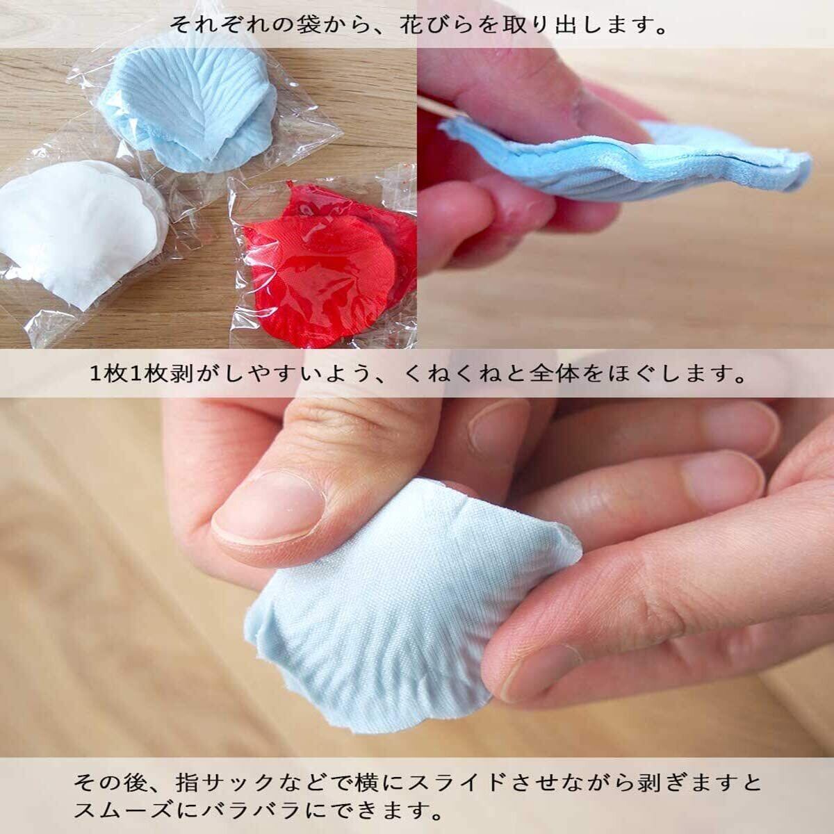【包 装】花びらは真空に100枚ずつに圧縮されているので、 小包が届く時一枚一枚ずつほぐする必要があります。各カラー100枚ごとに圧縮されていますのでご使用の際はほぐしてお使いください。