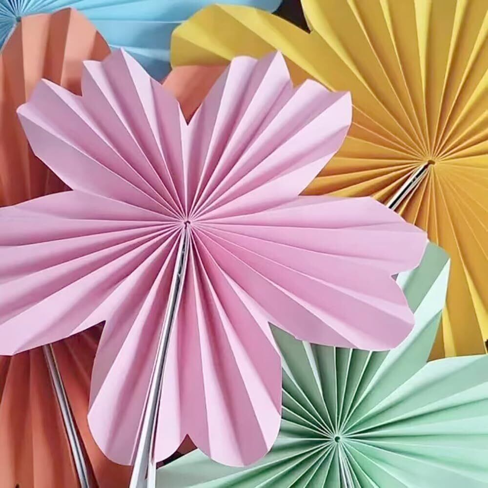 セット内容: パステルカラーの花型ペーパーファン9枚セット。ピンク、オレンジ、マクロンカラーの3色があります。