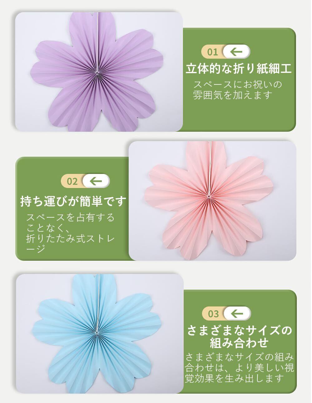デザイン: 繊細な花びらの形状で、立体的な扇状のデザイン、鮮やかな発色の紙を使用しています。ペーパーファンはそれぞれ色とサイズが異なります、開いた時の直径は:35cm-3枚、25cm-3枚、20cm-3枚。