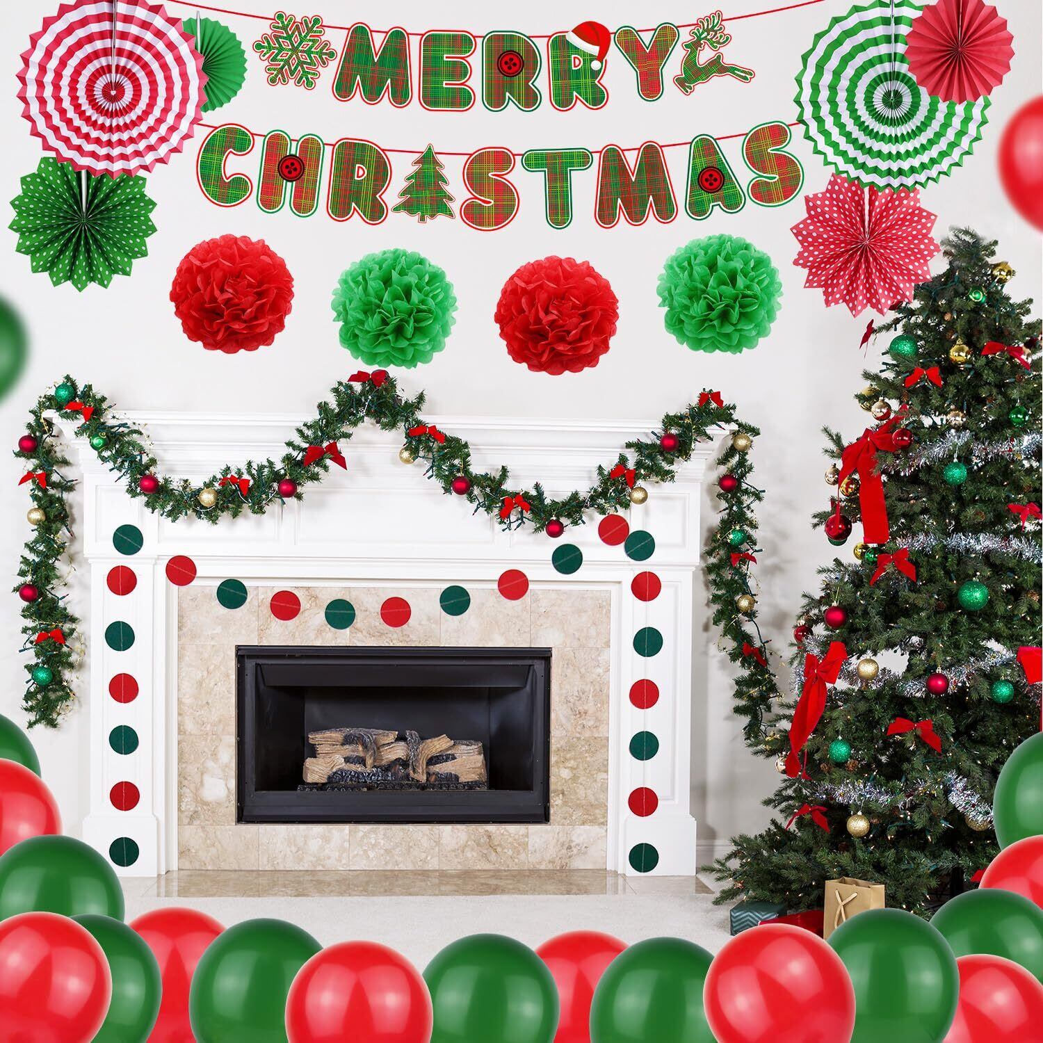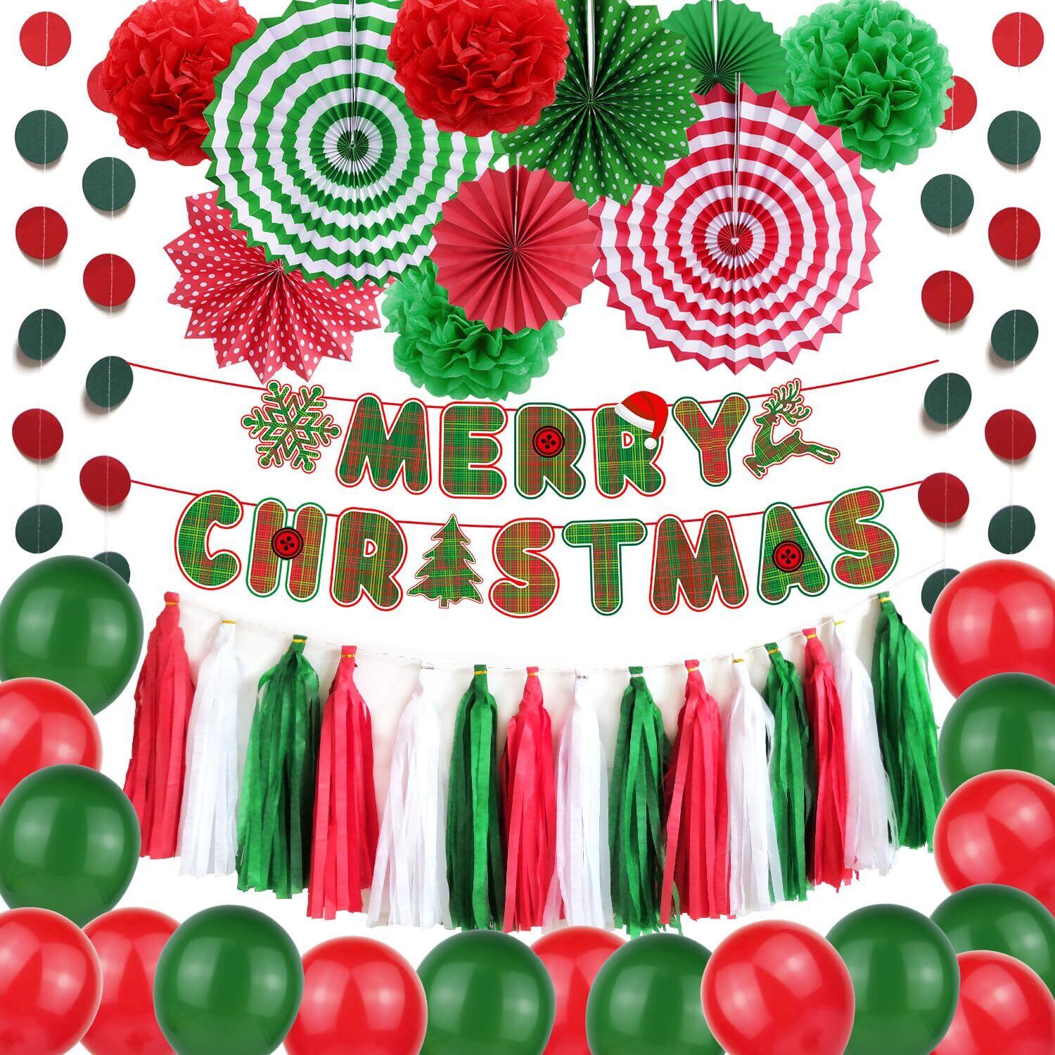クリスマス ペーパーファン ポンポン 花紙 ガーランド 飾り付けセット 34点 赤、緑 クリスマス飾り