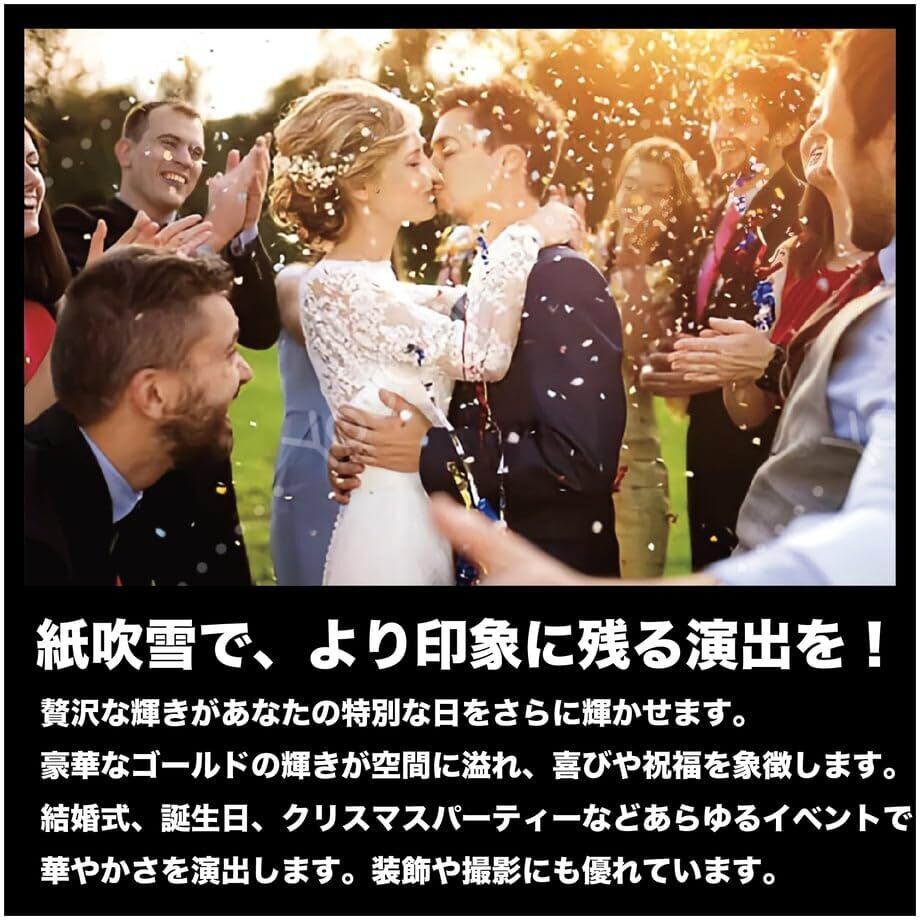 【用途】キラキラ紙吹雪は、派手で華やかな雰囲気を演出するためひ必要不可欠なアイテムです。 その魅力は、まずその色合いにあります。金色は贅沢さと高級感を象徴し、パーティー会場やイベントの装飾において特別な輝きを与えます。 ゴールドの紙吹雪が舞う様子はまるで宝石が散りばめられたような美しさで、会場全体を華やかに彩ります。 この紙吹雪は、使い勝手も抜群です。軽量で丈夫なので、持ち運びや設置が簡単で長い期間保存が可能です。