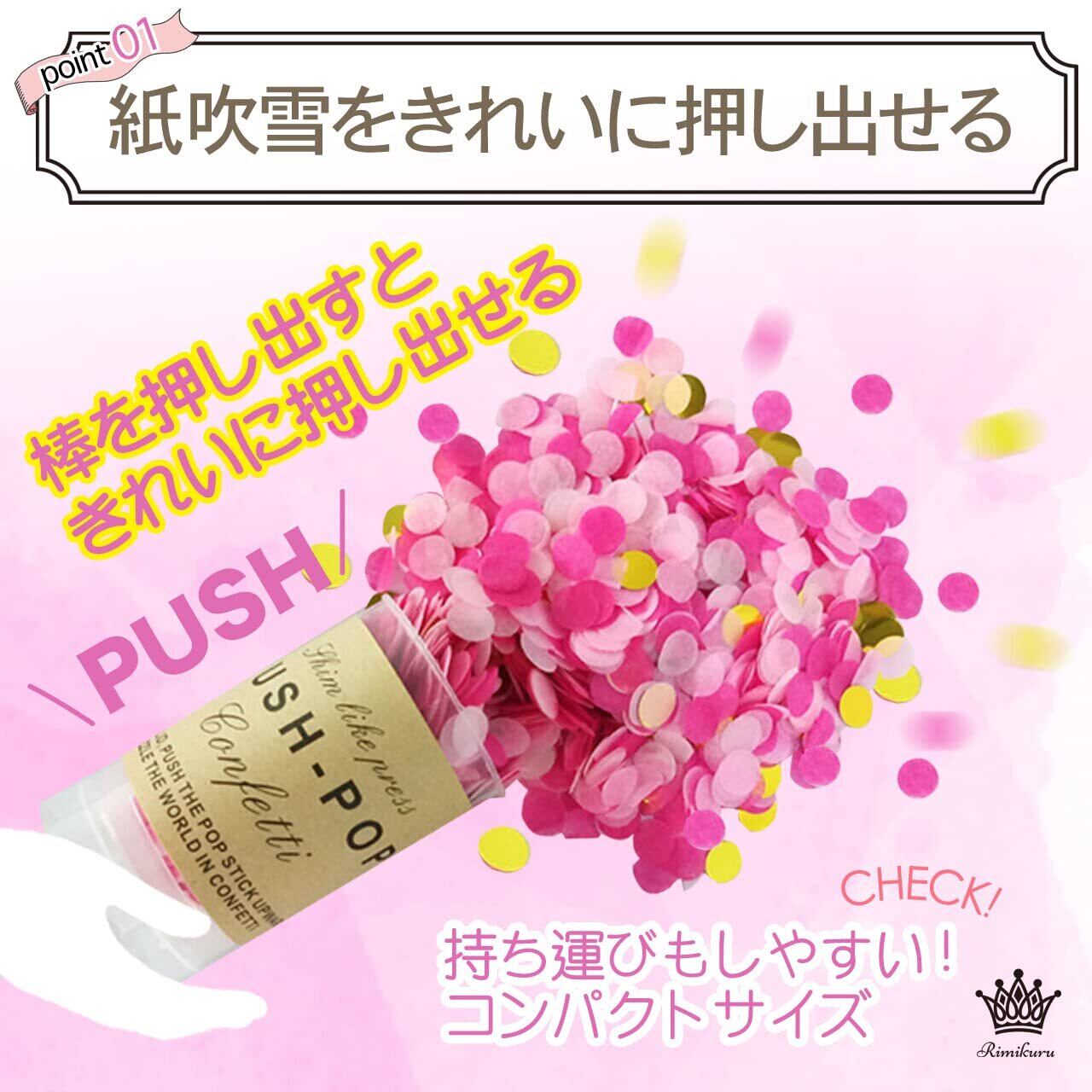 紙吹雪をきれいに押し出せる:こちらのパーティー クラッカー 紙吹雪はプラスチックのプッシュ式のケースに入っているので、棒をグッと押し出すと紙吹雪をふんわりと、きれいに押し出すことができます。また、持ち運びもしやすいコンパクトサイズです。