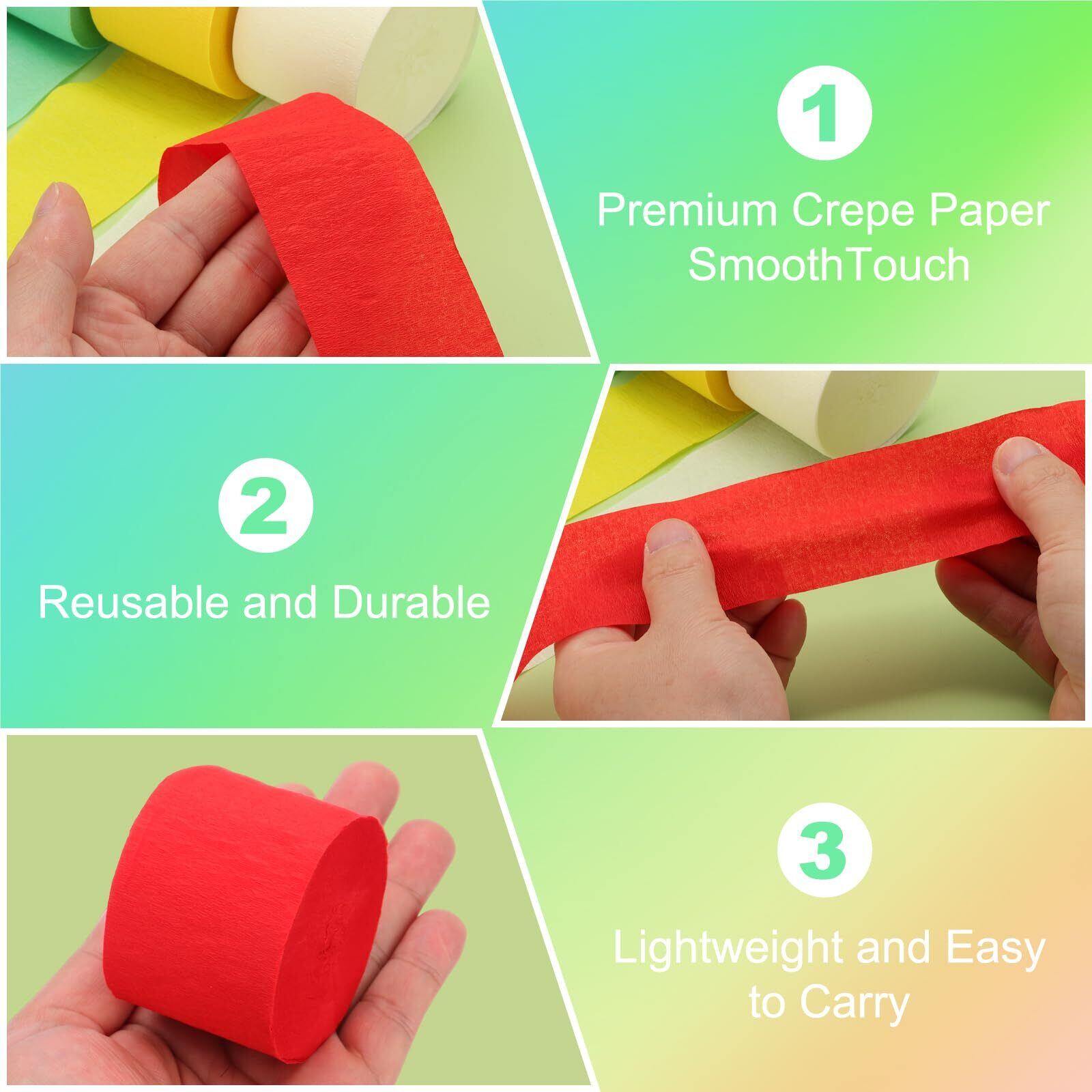 利点:クレープペーパーストリーマーは、プレミアムクレープペーパーで作られており、鮮やかで飽和した色、滑らかな触り心地、軽量で持ち運びが簡単で、長いロールに巻かれており、ねじるのが簡単で、再利用可能で丈夫