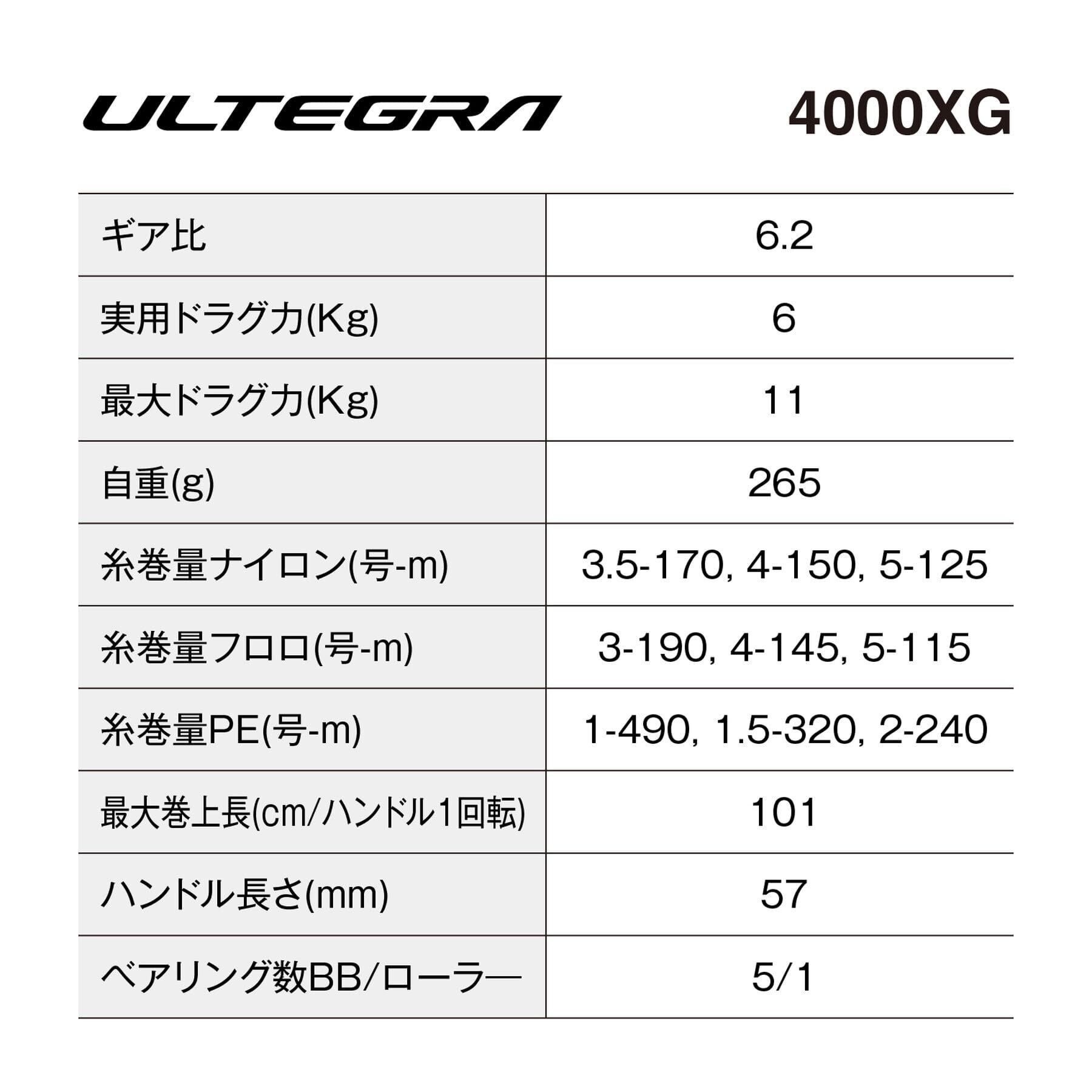糸巻量:ナイロン(号-m) 3.5-170、4-150、5-125 / フロロ(号-m) 3-190、4-145、5-115 / PE(号-m) 1-490、1.5-320、2-240